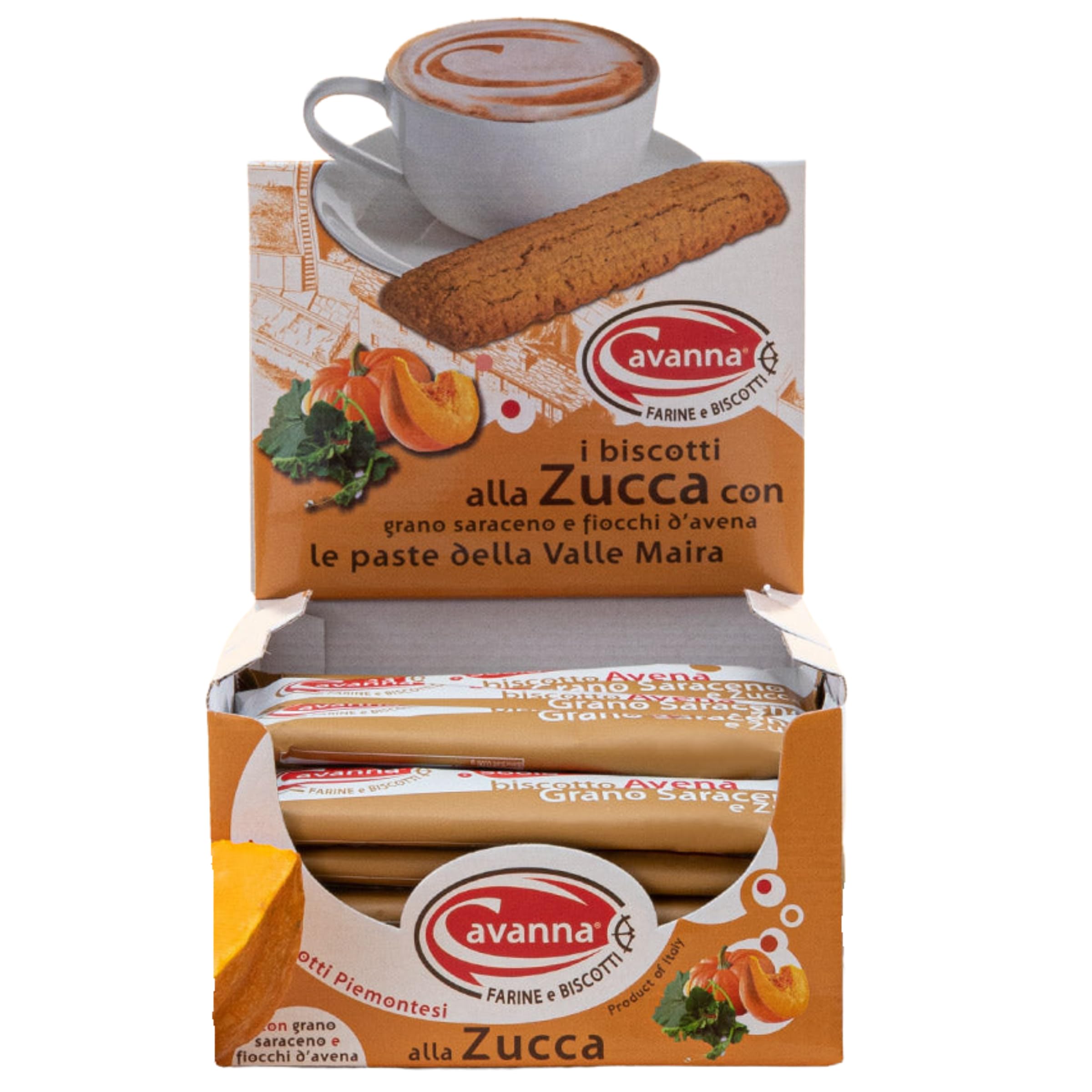 A biscuit with a great blend of flavors! A biscuit whose ingredients evoke the autumn season, but which is delicious all year round! The oat and whole wheat buckwheat biscuit is made with our stone-ground buckwheat flour, naturally gluten-free and highly digestible. We use pumpkin pulp, ideal for lightening the biscuit and making it easy to digest. Light yet rich in fiber, highly recommended. The single-serving biscuits have several advantages: individually wrapped while still warm, they retain all their flavor. The individual packaging is ideal for children, for school snacks, or as snacks during sports and walks. No artificial colors, no preservatives, no GMOs. Ingredients: stone-ground type "1" soft wheat flour, stone-ground wheat flour 10 , oat flakes 10 , cane sugar, butter, sunflower oil, pumpkin pulp 8 , fresh eggs, raising agent: ammonium bicarbonate, whole sea salt. May contain traces of nuts and soy. Nutritional values: Energy: 2061 kJ 492 kcal Fat: 22 g of which saturates: 9.3 g Carbohydrate: 64 g of which sugars: 25 g Fiber: 4.0 g Protein: 6.8 g Salt: 0.13 g INGREDIENTS Whole buckwheat flour, rice flour, corn flour, chestnut flour, cocoa butter, sunflower oil, pear pulp 12 , fresh eggs, cane sugar, fruit in varying proportions 5 (apple, peach, pear), raising agent: ammonium bicarbonate, whole grain sea salt. May contain hazelnuts, almonds, soy, and mustardCavanna Biscuits à l'avoine, avec sarr et citrouille emballés individuellement 30 gr - pauvre de sodium (présentoir 30 pièces) - Fabriqué en ItalieDESCRIPTION DU PRODUIT DESCRIPTION DU PRODUIT Biscuit avec un grand mélange de saveurs ! Un biscuit qui pour les ingrédients rappelle la saison d'automne, mais qui est bon toute l'année ! Le biscuit avoine et blé sarr intégral est fait avec notre farine de sarr moulue à la pierre, naturellement sans gluten et hautement digestible. Nous utilisons la citrouille en pulpe, idéale pour alléger le biscuit et le rendre digestible. Léger et en même temps riche en fibres, très recommandé. Les biscuits mono-portion ont plusieurs avantages : emballés un par un encore chaud, ils conservent tout leur parfum. L'emballage individuel est idéal pour les enfants, pour le goûter à l'école ou comme collations pendant le sport et les promenades. Sans colorants sans conservateurs sans OGM Ingrédients : farine de gran tendre type "1" moulue à la pierre, farine de blé moulue à pierre 10 , flocons d'avoine 10 , sucre de canne, beurre, huile de tournesol, pulpe de citrouille 8 , œufs frais, agent levant : bicarbonate d'ammonium, sel de mer intégral. Peut contenir des traces de fruits à coque et SOIA. Valeurs nutritionnelles : énergie : 2061 kJ 492 kcal Graisses : 22 g dont acides gras saturés : 9,3 g Glucides : 64 g dont sucres : 25 g Fibres : 4,0 g Protéines : 6,8 g Sel : 0,13 g INGRÉDIENTS Farine intégrale de sarr, farine de riz, farine de maïs pignolet, farine de châtaignes, beurre de cacao, huile de tournesol, pulpe de poire 12 , œufs frais, sucre de canne, fruits en proportion variable 5 (pomme, pêche, poire), agent levant : bicarbonate d'ammonium, sel marin intégral. Peut contenir des noisettes, des amandes, du soja et de la moutarde