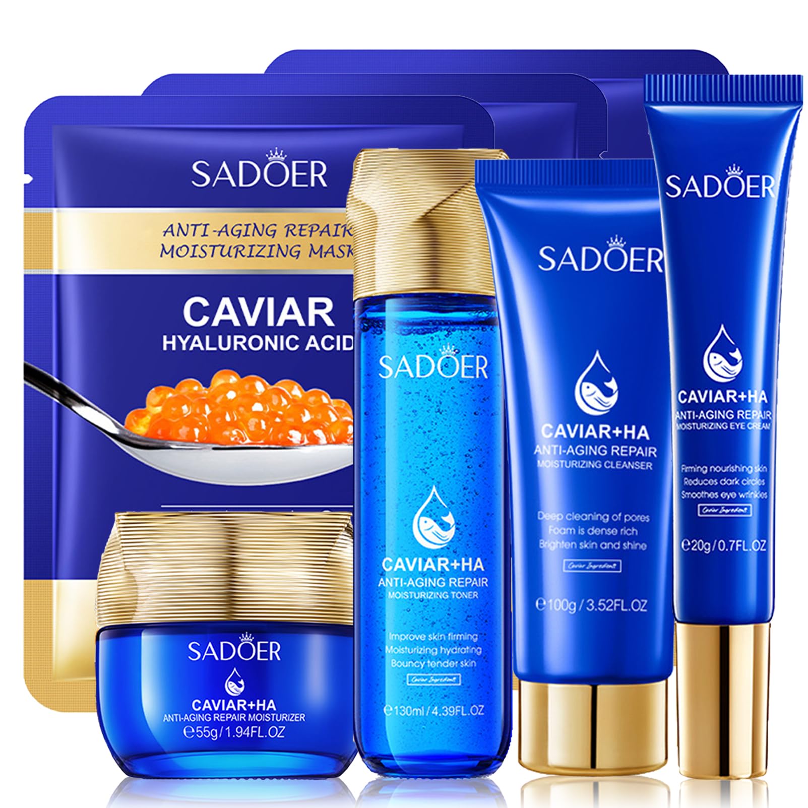 Product Name: Caviar Essence & Hyaluronic Acid skincare set Product Quality:Face cream, eye cream, toner, serum, face mask*2 pack Shelf Life: 3 Years FEATURES Introducing the ultimate skincare set that will transform your skin care routine! Our Caviar & Hyaluronic Acid Skincare set is the perfect addition to your daily face care set for women. This luxurious skin care kit is designed to provide optimal skin care benefits for all skin types - whether it is dry, oily, or combination skin. Our skincare gift set contains a combination of two powerful ingredients - hyaluronic acid and caviar essence - which work together to deliver unmatched hydration and nourishment to your skin. Hyaluronic acid is a highly effective moisturizing agent that draws water to the skin, keeping it hydrated and plump. Caviar essence, on the other hand, contains amino acids, vitamins, and minerals that work to repair and rejuvenate the skin, leaving it looking firm, smooth, and youthful. This skincare set includes a caviar & hyaluronic acid serum, face cream, and eye cream that can be used together or as part of your existing skin care routine. The light-weight texture of the products makes them easy to apply and absorb quickly into the skin, leaving no residue. Our skin care sets & kits are packaged elegantly. It is suitable as a gift for friends and family whom you care about. So, why wait? Treat your skin to the hydration and nourishment it deserves with our Caviar & Hyaluronic Acid Skincare set today! Tips: For external use only. If there is redness or allergic reaction, please stop using it immediately. Please keep it away from children. Store in a cool and shade place. SAFETY WARNING NO?Perfect Gift for All Occasions?: Our all-in-one skincare gift set, including cleanser, toner, cream, eye cream, and mask, makes a thoughtful gift for women and girls on festivals, Christmas, Valentine's Day, and Mother's Day, give her a radiant and youthful skin, promote better self-confidence!. ?Your Everyday Skincare Routine?: Our Caviar & Hyaluronic Acid skin care sets & kits includes everything you need for your daily skincare regimen, cleaning, toning, moisturizing, and protecting against aging for rejuvenate, radiant skin. ?Suitable for All Skin Types?: Our non-greasy, lightweight skin care kit is perfect for dry skin and all skin types, even sensitive skin types. Helps to repair damaged skin barriers, making your skin more resistant, healthier and more natural, delivering lasting moisture and nourishment that leaves the skin supple and hydrated. ?Fights Against Aging and Nourishes Skin?: Our caviar essence formulas in the face cream, eye cream, toner, and serum are effective in combating skin aging, reducing wrinkles, and repairing damaged skin, promoting a healthy, youthful complexion. Enhance skin resistance, improve dull and rough skin, promote a radiant and youthful skin!. ?Caviar Essence & Hyaluronic Acid Skin Care Set?: Experience the benefits of both caviar and hyaluronic acid in our skincare set, which deeply replenishes and locks in moisture for a whole day, promoting healthy, hydrated skin.