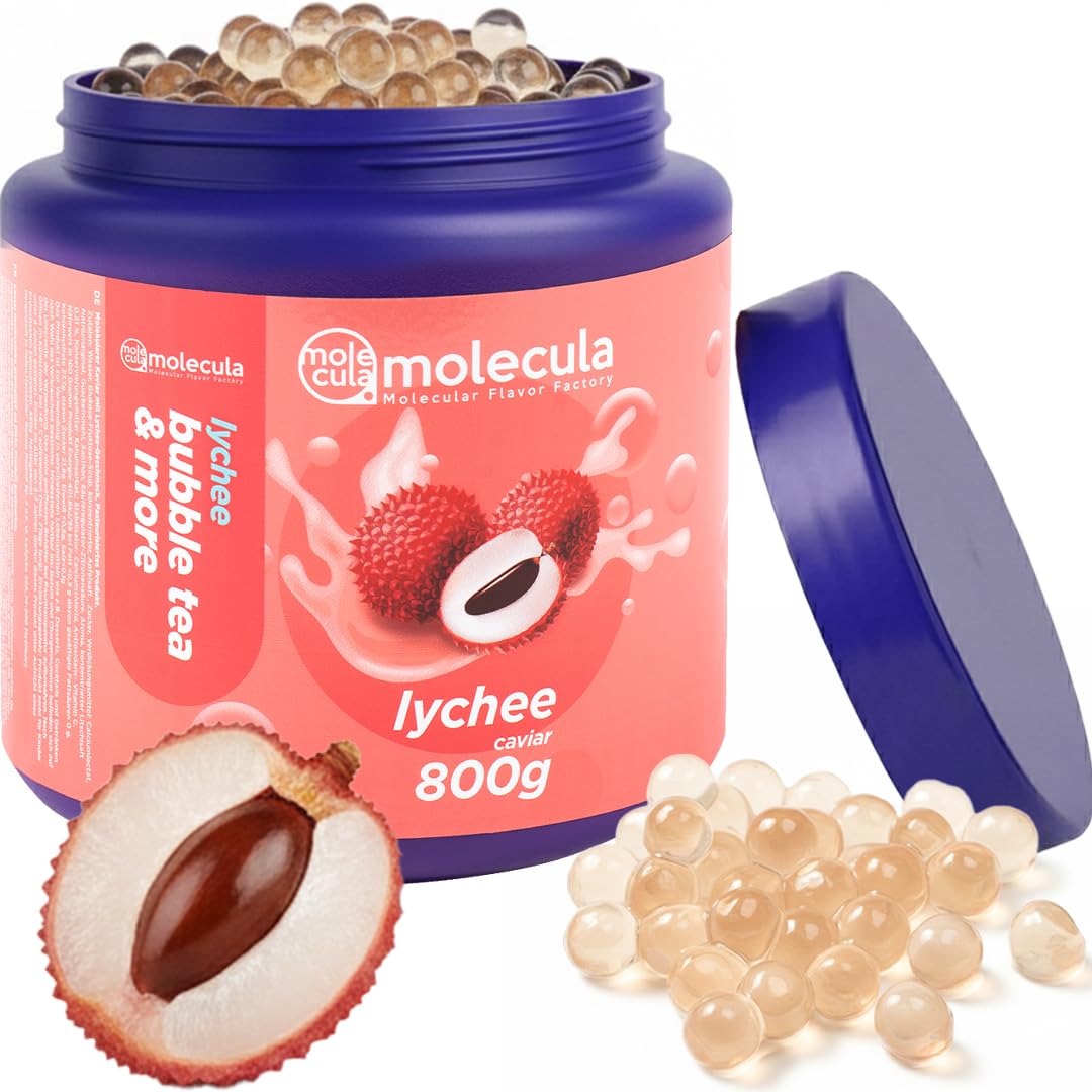 We don't use artificial colors or high-fructose corn syrup. The basic ingredients for our production are seaweed, calcium lactate, natural concentrates, and flavorings. Molecula Molecular Taste Factory specializes in producing two key ingredients for bubble tea: fruit concentrates and molecular pearls. We add seaweed to fruit syrups and then soak them in a natural calcium solution. This creates capsules of various flavors, which will delight customers time and again in drinks served in every ice cream parlor, restaurant, and nightclub. Simply add a few tablespoons of our molecular caviar and pieces of your favorite fruit to a glass of tea or cold milk. You can also add a special bubble tea syrup, which you can find in our other listings. Enjoy! No artificial colors, no high-fructose corn syrup, suitable for vegetarians and vegans, lactose-free, gluten-free. Original molecular caviar for bubble tea - 800g - Lychee.Nous n'utilisons pas de colorants artificiels ni de sirop de glucose-fructose. Les ingrédients de base pour la production sont les algues, le lactate de calcium, les concentrés naturels et les arômes. Molecula Molecular Taste Factory est spécialisé dans la production de deux ingrédients de base pour le thé à bulles : concentrés de fruits et perles moléculaires. Nous ajoutons des algues aux sirops de fruits et les trempons ensuite dans une solution de calcium naturel. De cette façon, des capsules de différentes saveurs sont créées, ce qui émerveillera encore et encore les clients dans les boissons servies dans chaque salon de glace, dans chaque restaurant et dans chaque boîte de nuit. Il suffit d'ajouter quelques cuillères à soupe de notre caviar moléculaire et des morceaux de vos fruits préférés à un verre de thé ou de lait froid. Vous pouvez également ajouter un sirop spécial de thé à bulles que vous pouvez trouver dans nos autres annonces. Amusez-vous bien. Sans colorants artificiels, sans sirop de fructose-glucose, pour végétariens et végétaliens, sans lactose, sans gluten. Caviar moléculaire original pour thé à bulles - 800g- Lychee.Caviar moléculaire aromatisé au litchi 0,8kg