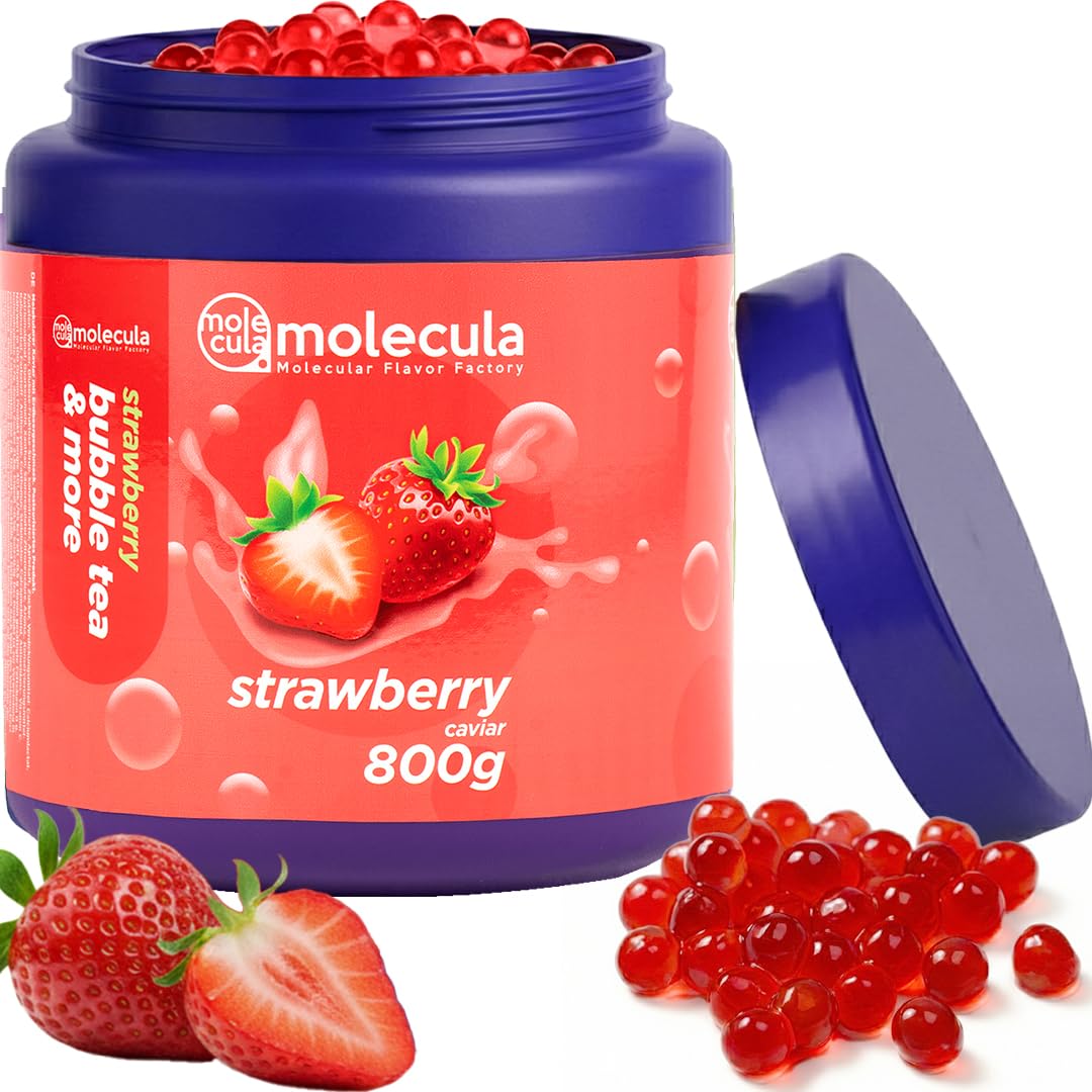 We don't use artificial colors or high-fructose corn syrup. The basic ingredients for our production are seaweed, calcium lactate, natural concentrates, and flavorings. Molecula Molecular Taste Factory specializes in producing two key ingredients for bubble tea: fruit concentrates and molecular pearls. We add seaweed to fruit syrups and then soak them in a natural calcium solution. This creates capsules of various flavors, which will delight customers time and again in drinks served in every ice cream parlor, restaurant, and nightclub. Simply add a few tablespoons of our molecular caviar and pieces of your favorite fruit to a glass of tea or cold milk. You can also add a special bubble tea syrup, which you can find in our other listings. Enjoy! No artificial colors, no high-fructose corn syrup, suitable for vegetarians and vegans, lactose-free, gluten-free. Original molecular caviar for bubble tea - 800g - Strawberry.Nous n'utilisons pas de colorants artificiels ni de sirop de glucose-fructose. Les ingrédients de base pour la production sont les algues, le lactate de calcium, les concentrés naturels et les arômes. Molecula Molecular Taste Factory est spécialisé dans la production de deux ingrédients de base pour le thé à bulles : concentrés de fruits et perles moléculaires. Nous ajoutons des algues aux sirops de fruits et les trempons ensuite dans une solution de calcium naturel. De cette façon, des capsules de différentes saveurs sont créées, ce qui émerveillera encore et encore les clients dans les boissons servies dans chaque salon de glace, dans chaque restaurant et dans chaque boîte de nuit. Il suffit d'ajouter quelques cuillères à soupe de notre caviar moléculaire et des morceaux de vos fruits préférés à un verre de thé ou de lait froid. Vous pouvez également ajouter un sirop spécial de thé à bulles que vous pouvez trouver dans nos autres annonces. Amusez-vous bien. Sans colorants artificiels, sans sirop de fructose-glucose, pour végétariens et végétaliens, sans lactose, sans gluten. Caviar moléculaire original pour thé à bulles - 800g- Fraise.Caviar moléculaire au goût de fraise 0,8kg
