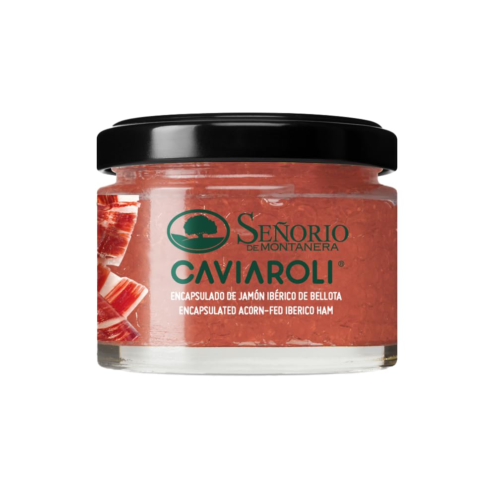 Caviaroli Extra virgin olive oil pearls with the taste of Iberian Bellota ham - Gastronomic oil pearls for vinaigrette or decoration - 50 grams.