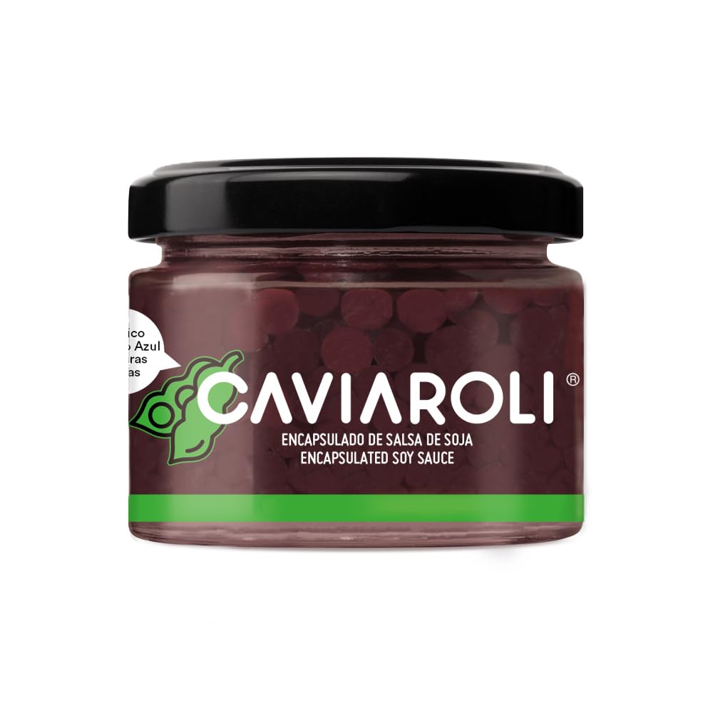 Caviaroli Soy Sauce Perles Gourmande for Dressing or Decoration Jar 50g. Soy sauce spheres inside the liquid popping in the mouth when you bite them. Brown color and Umami flavor.