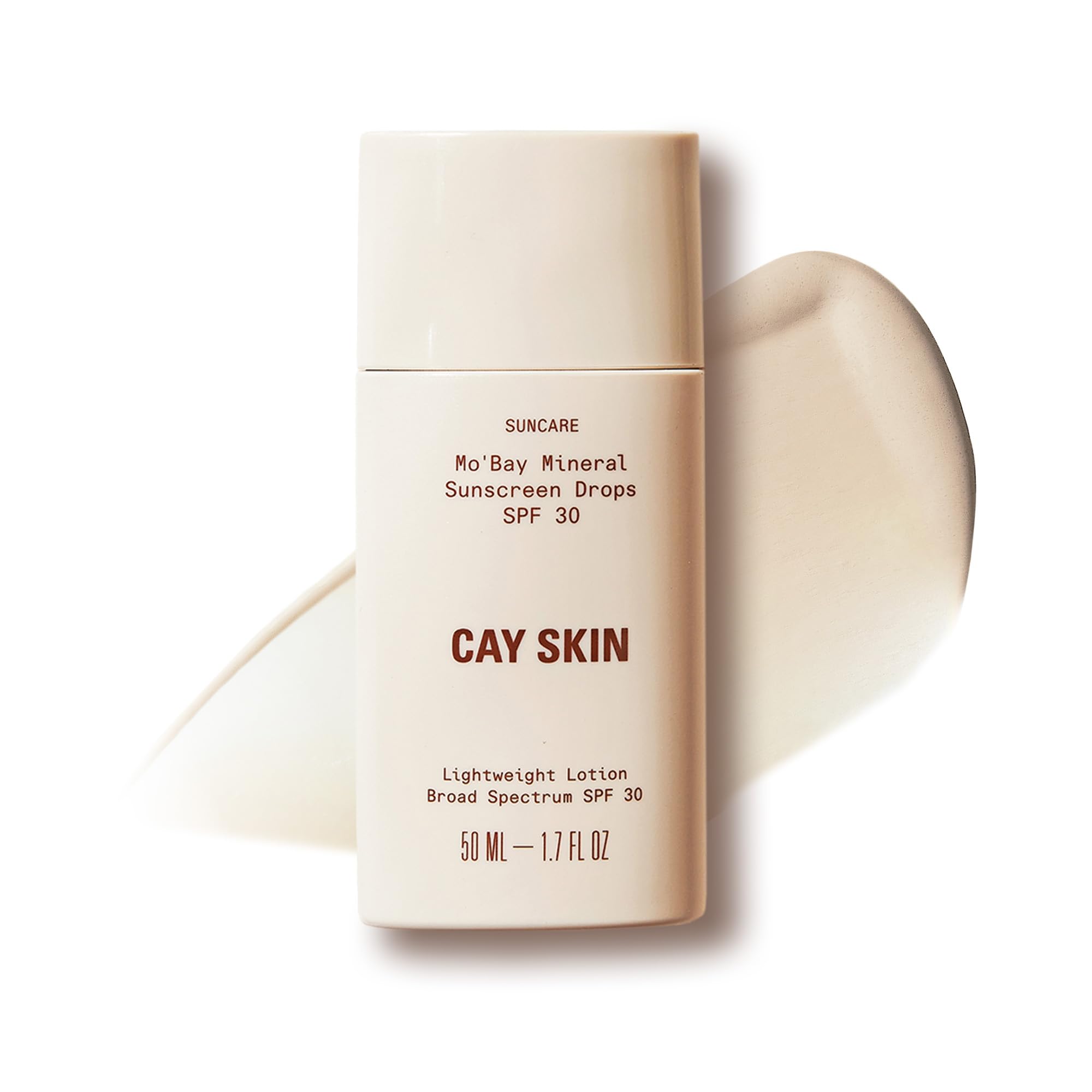Skincare for Everyone Under the Sun: Cay Skin is daily skincare with SPF—created to keep you confident, glowing protected throughout the year all of our products are silicone-free, vegan, cruelty-free, reef-friendly dermatologist-tested. How to Apply: Gently shake the bottle, dispense a dime-sized amount evenly onto face neck 15 minutes before sun exposure, reapplying every 2 hours or after swimming or perspiring use alone or as the last step of your skincare routine before makeup application. Skin-Loving Ingredients: Our clean, vegan formula is enriched to strengthen and protect the skin's moisture barrier with Fermented Guava to rebalance the skin's microbiome 100 Mineral Zinc Oxide to deflect the sun's harmful rays. Gentle Formula with Natural Finish: This lightweight, barely-there sunscreen is non-comedogenic, contains no synthetic fragrance provides a sheer natural finish without the white cast suitable for all skin types, Mo'Bay Mineral Sunscreen is even recommended for sensitive blemish-prone skin. Suncare Meets All-Day Primer: Mo'Bay Mineral Sunscreen is a 100 mineral SPF 30 lotion that glides over your skin like a serum to provide broad spectrum protection against UVA UVB rays this blendable, non-greasy sunscreen also acts as a weightless makeup-gripping primer to lock in your look.