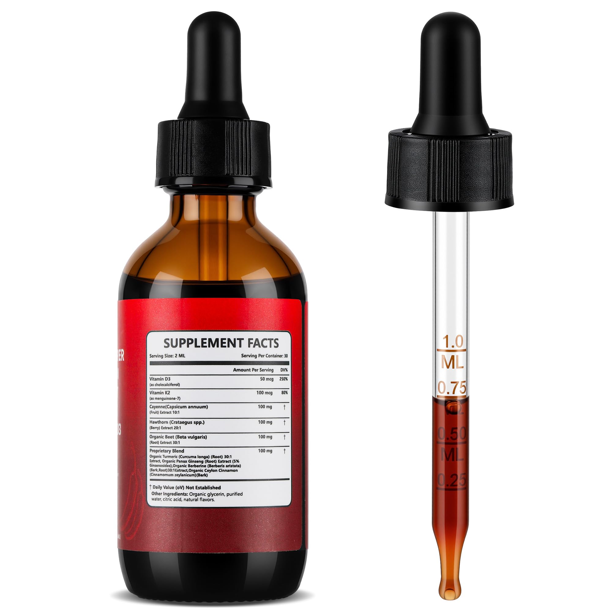 Each 60ml bottle provides 30 daily servings (2ml per serving). This 2-bottle set delivers a 60-day supply, perfect for consistent daily use. Comes in a durable glass bottle with a dropper for precise control. The liquid form allows for easy absorption and convenient use at home or on the go,perfect for supporting your daily wellness routine. Store in a dry, cool place at room temperature, and keep out of the reach of children. Take 2ml daily.For added versatility, mix a few drops into water, tea, juice, or smoothies to create a tasty drink. Ingredients including cayenne pepper, hawthorn, beet root,turmeric,plus essential vitamins K2 and D3.