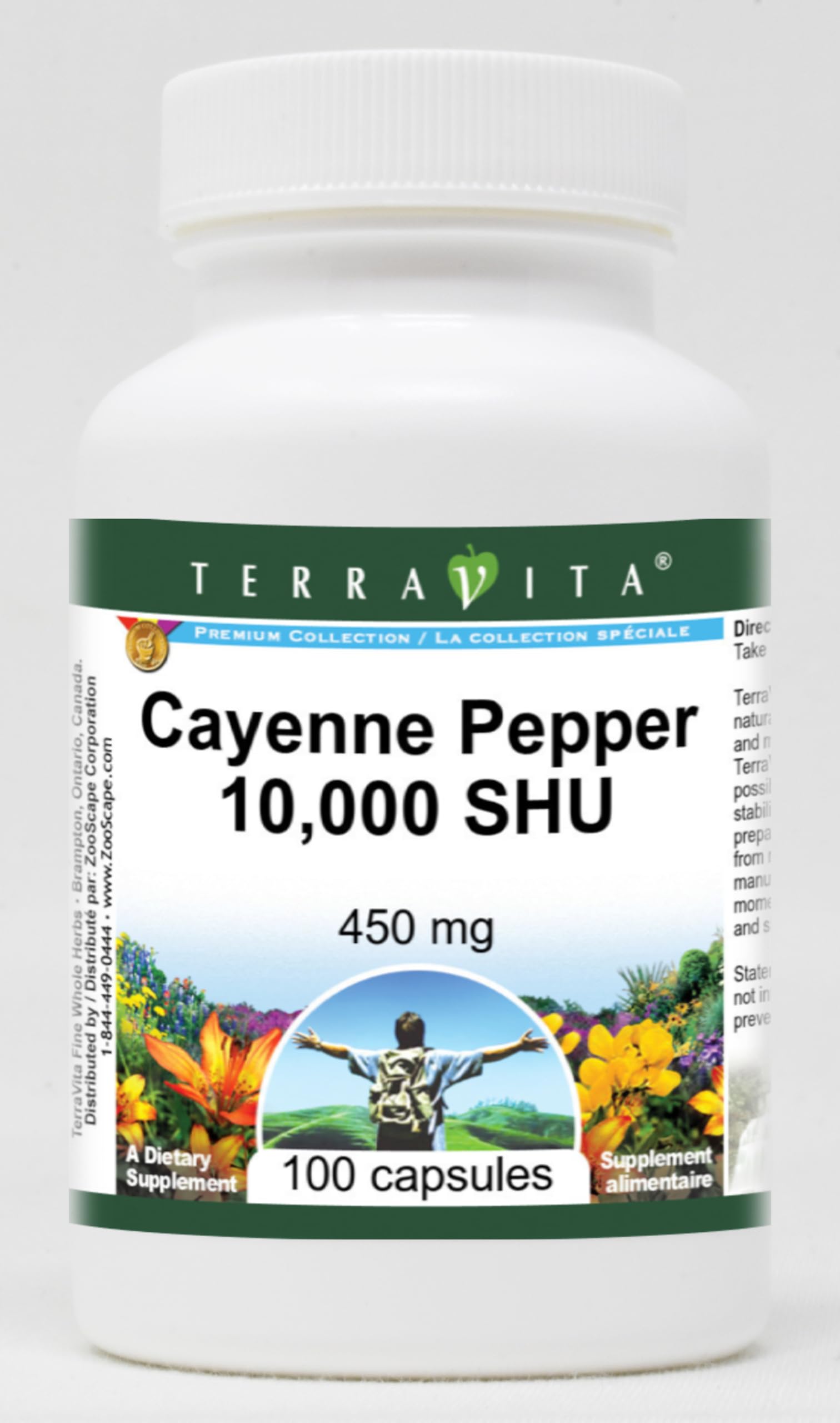Cayenne Pepper 10,000 SHU - 450 mg (100 capsules, ZIN: 521120) Packaged in the United States in a GMP certified facility (Good Manufacturing Practice). No fillers. Manufacturer: TerraVita Size: 100 capsules Easy-to-swallow Capsules in a sealed bottle. Ingredients: Gelatin, Water, Cayenne Pepper 10,000 SHU - 450 mg