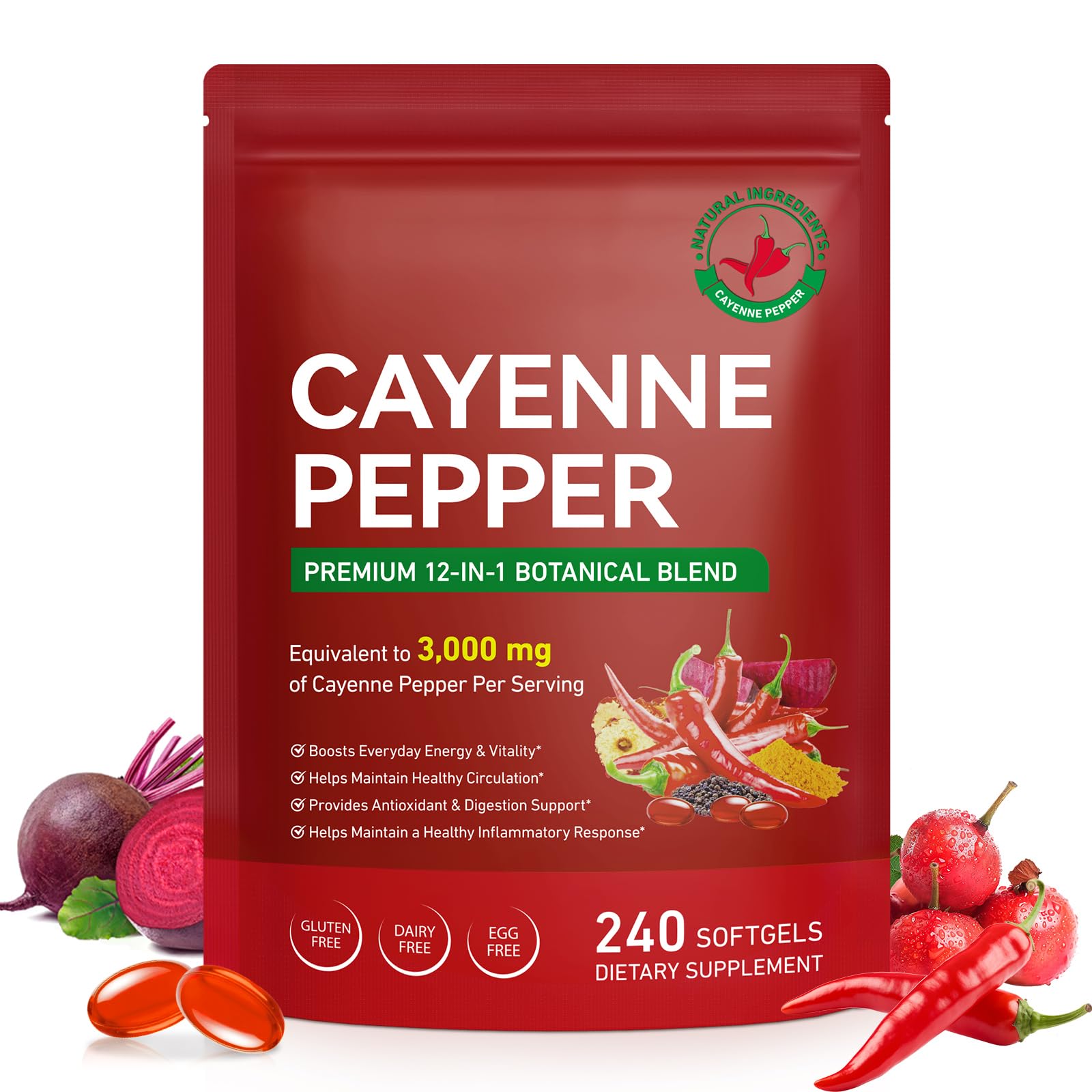 Feature: Boosts Everyday Energy Vitality Supports Maintain Healthy Circulation Provides Antioxidant Digestion Support Encourages Balanced Vitality Promotes Natural Wellness Balances Overall Health Premium 12-in-1 Botanical Blend Cayenne Pepper Grape Seed Hawthorn Black Pepper Turmeric Beetroot Vitamin D3 K2 etc. Other Ingredients: Soybean oil, Gelatin, Glycerin, Mono- and Diglycerides of Fatty Acids, Water. Free of: Gluten, Dairy, Eggs, Fish Shellfish, Peanuts Tree Nuts. Suggested Use: Take three (3) softgels daily with a glass of water, or as directed by your healthcare professional. Package List: Cayenne Pepper Capsules, 240 Softgels80-Day Supply: A full 80-day supply (240 softgels) delivers lasting value. Easy-to-swallow softgels make it simple to get your daily dose. Promote Digestive Comfort Gut Balance: Ingredients like turmeric and ginger work synergistically to soothe the digestive system, maintain gut health, help manage occasional inflammation, and enhance daily comfort. Immune Antioxidant Vitamin Boost: Enhanced with Vitamins D3, K2, and E, this formula extends beyond herbal benefits to comprehensively support robust immune function, strong bone health, and provide antioxidant protection against free radical damage. Blood Circulation Healthy Metabolism: Traditional herbal ingredients like black pepper and hawthorn effectively promote blood circulation. Combined with berberine and cinnamon, this formula further supports maintaining healthy blood sugar levels and achieving metabolic balance. 12-in-1 Supplement: This product combines 12 core botanical extracts and vitamins, including cayenne pepper, grape seed, and hawthorn, to provide comprehensive health support. This synergistic formula is designed to promote energy metabolism, enhance metabolic health, and support blood circulation.