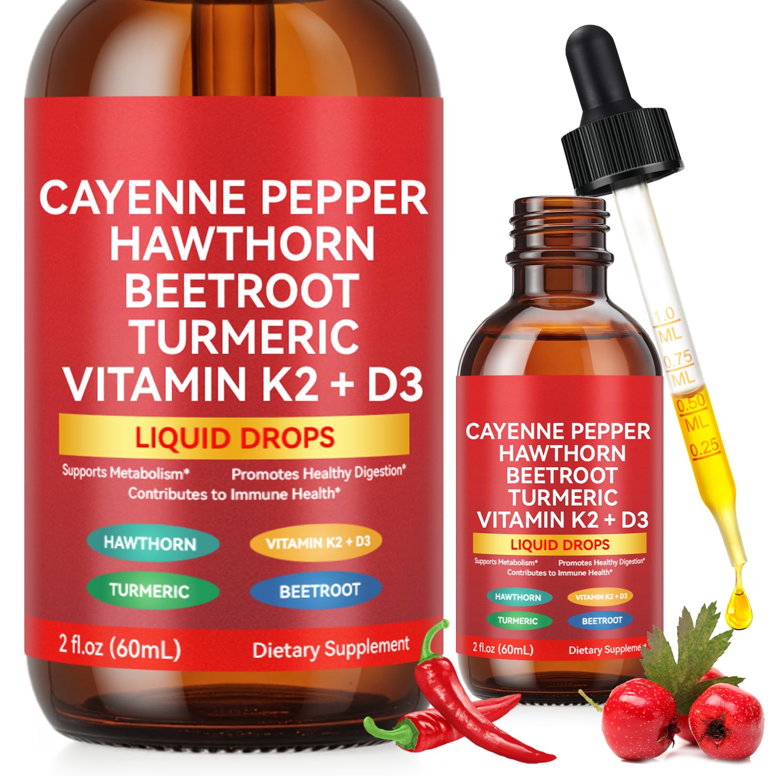 Boosts Energy Levels: The energizing properties of cayenne pepper combined with beetroot provide a natural lift to your daily activities, enhancing both physical and mental performance. Supports Healthy Circulation: Ingredients like hawthorn and beetroot work synergistically to improve blood flow and enhance cardiovascular health, promoting overall well-being. Contributes to Immune Health: Packed with essential vitamins D3 and K2, this powerful blend helps fortify your immune system, keeping you resilient against seasonal challenges. Promotes Healthy Digestion: The combination of cayenne pepper and turmeric aids in digestive health, making it easier for your body to process nutrients and eliminate waste. Supports Metabolism: Our cayenne pepper drops are formulated to enhance metabolic function, helping you maintain energy levels and promote weight management effectively.