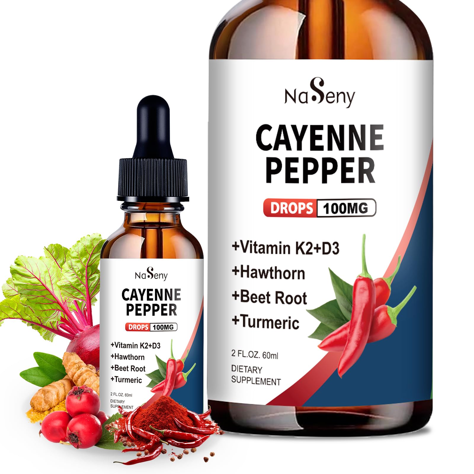 Premium Quality You Can Trust Our cayenne pepper drops are tested by a third-party lab to ensure purity, potency, and quality. Our cayenne pepper supplement is a natural organic, gluten-free, non-GMO, plant-based, Vegen-friendly and devoid of preservatives, artificial colors. High Absorption NaSeny Natural cayenne pepper supplement use a solvent-free water extraction process for enhanced absorption, offering rapid absorption and high bioavailability by bypassing digestion to prevent nutrient loss and enhance absorption efficiency. D3 and K2 Supplement for Immune, Gut Health and Antioxidant Our organic cayenne pepper supplement is enriched with vitamins D3 and K2 to enhance calcium absorption in the intestines, boost immunity, and provide antioxidant benefits. With added ingredients like Ceylon cinnamon, hawthorn berry, and ginseng extract, Cayenne Pepper Drops are an ideal natural solution for overall wellness. Supporting multiple health benefits Our Cayenne Pepper Drops are made from a combination of traditional herbs and essential vitamins, which can support our various healthy lifestyles, including digestive and heart health, peaceful mood, and immune system health for both men and women. 9- in-One Cayenne Pepper Drops This comprehensive liquid formula blends organic cayenne pepper with powerful botanicals hawthorn berry, Panax ginseng, Ceylon cinnamon, beetroot, and turmeric to elevate your daily wellness routine. while improving overall health by improving digestion, strengthening the immune system, and supporting circulatory health.