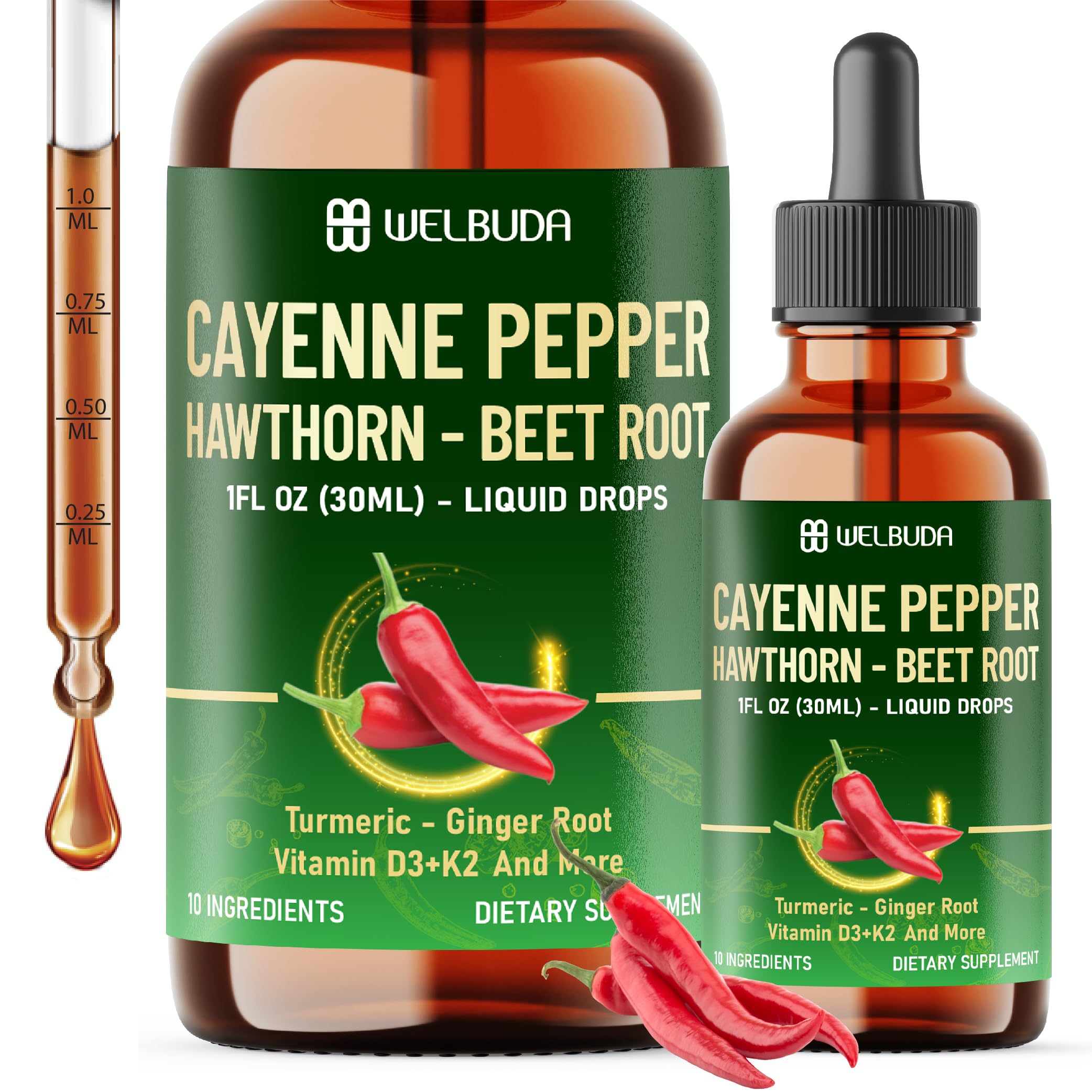 Customer Satisfaction: Please contact us if you have any questions and we will support you immediately. Guaranteeing health products for you and your family life. And accompanying customers on the journey of healthcare. Commitment To Safety Quality: We take great pride in the fact that Cayenne Pepper Liquid Drops is made entirely of components that have been studied and successfully used throughout the world. It is also non-GMO, and gluten-free. All our products are third-party tested to ensure quality by a USA-verified Lab. Easy Daily Routine: Take 1ml of Liquid Cayenne Pepper per day. Each bottle provides a full 1-month supply, easy to take directly or mix with your favorite drink. Targeted Support: Support heart health, overall vitality, nutrient absorption, and supports mobility with each serving. 10 in1 Cayenne Pepper Liquid Supplement blends essential vitamins and herbal extracts like Vitamin D3, K2, cayenne pepper, and hawthorn berry to support overall vitality, nutrient absorption and heart health.