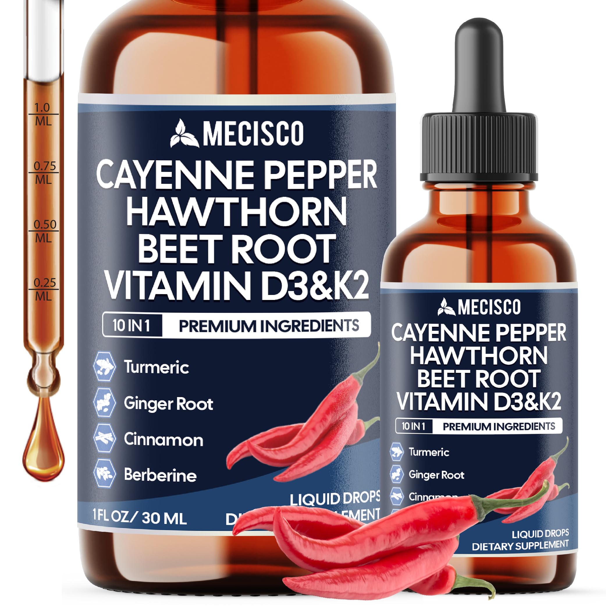 ✓ Satisfaction Guaranteed: Mecisco Bottles are a comprehensive refund policy. Our mission is to offer our customers beneficial supplements of high quality. If, for any reason, you are dissatisfied with your order, please don't hesitate to reach out to us to request a refund. Your satisfaction is our top priority. ✓ Outstanding Value: All Mecisco Supplement is sourced from a trusted certificated facility manufacturer by strict processes to ensure international quality standards such as cGMP, ISO, FDA Registered facility USA verified Laboratory. ✓ Easy Daily Routine: Take 0.5ml of Liquid Cayenne Pepper per day. Each bottle provides a full 2-month supply, easy to take directly or mix with your favorite drink. ✓ Targeted Support: Support heart health, overall vitality, Immune System, and supports Mobility with each serving. ✓ Wellness Support 10 in1 Cayenne Pepper Liquid Supplement blends essential vitamins and herbal extracts like Vitamin D3, K2, cayenne pepper, and hawthorn berry to support heart function, immune balance, and bone strength. Cayenne Pepper Liquid Drops with Vitamin D3, Vitamin K2, Hawthorn Berry, Beet Root, Ginger, Ceylon Cinnamon, Turmeric, Berberine - Digestion Support - 30ml - 60 Day Supply.