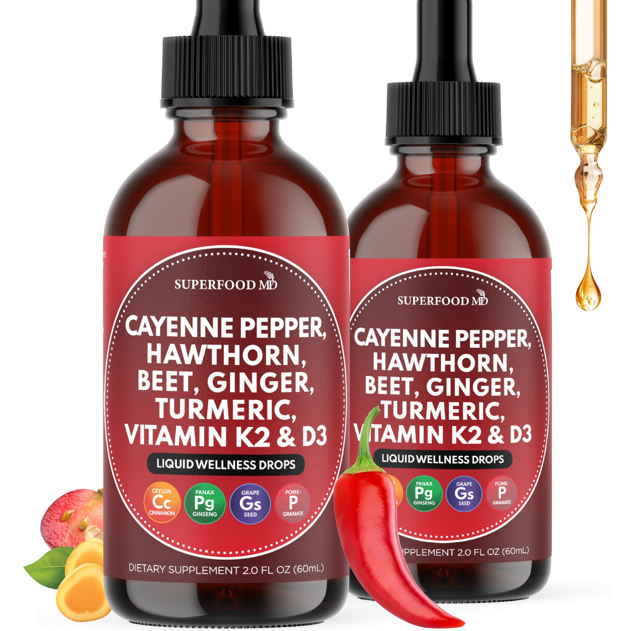Superfood MD Promise - Made in the USA with Non-GMO ingredients, these liquid drops undergo third-party testing on every batch for your safety. Featuring cayenne pepper supplements, hawthorn berry capsules in liquid drop, organic beets, turmeric liquid supplement, vitamin D3 K2, ginseng root, Ceylon cinnamon supplement, and berberine liquid drops makes this Superfood MD formulation. Immune Support Supplement with Vitamin D3 and Turmeric Liquid – Formulated with essential ingredients like vitamin K2, Ceylon cinnamon, berberine extract, organic hawthorn berry powder, and ginseng extract, this supplement is a simple way to support daily health. Designed for both men and women, it offers a plant-based wellness blend featuring turmeric powder in a convenient liquid drop form. D3 and K2 Supplements with Mineral Oil – The Superfood MD formula combines organic berberine, Panax ginseng, and organic cayenne pepper with essential nutrients like Ceylon cinnamon extract, organic hawthorn berry, and turmeric root. Crafted for easy daily use, it provides vital K2 and D3 vitamins to support overall wellness. Hawthorn Berry Extract with Turmeric Curcumin Supplement – This Amazing formulated blend features essential ingredients such as organic cayenne pepper, hawthorn berry, and turmeric. Enhanced with berberine and beetroot powder, this supplement also includes cinnamon and beetroot, both well-regarded in holistic health practices. Superfood MD Cayenne Pepper Liquid Drops – A potent combination of traditional herbs and essential vitamins, including organic Ceylon cinnamon, hawthorn berry extract, beetroot, turmeric, K2 D3 vitamins, ginseng, and berberine with Ceylon cinnamon. These vegetarian liquid drops deliver a concentrated plant-based formula designed to promote daily health and overall well-being.