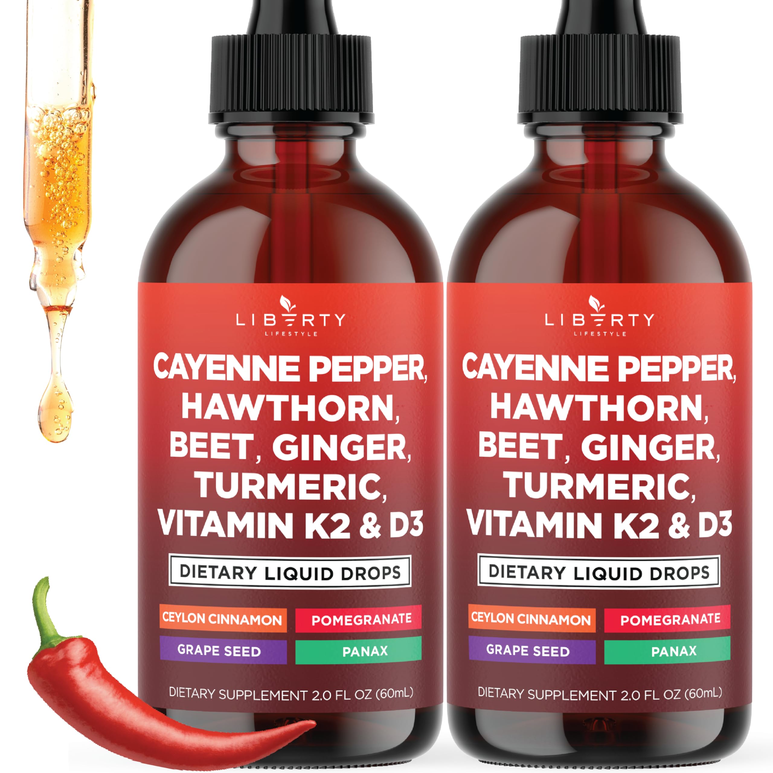 Trusted Quality - Made in the USA with Non-GMO ingredients, these liquid drops undergo third-party testing on every batch for your safety. Featuring cayenne pepper supplements, hawthorn berry capsules in liquid drop, organic beets, turmeric liquid supplement, vitamin D3 K2, ginseng root, Ceylon cinnamon supplement. Immune Support Supplement with Vitamin D3 and Turmeric Liquid – Formulated with essential ingredients like vitamin K2, Ceylon cinnamon, berberine extract, organic hawthorn berry powder, and ginseng extract, this supplement is a simple way to support daily health. D3 and K2 Supplements with Mineral Oil – This formula combines organic berberine, Panax ginseng, and organic cayenne pepper with essential nutrients like Ceylon cinnamon extract, organic hawthorn berry, and turmeric root. Enhanced with berberine and beetroot powder, this supplement also includes cinnamon and beetroot, both well-regarded in holistic health practices. Hawthorn Berry Extract with Turmeric Curcumin Supplement – This thoughtfully formulated blend features essential ingredients such as organic cayenne pepper, hawthorn berry, and turmeric.