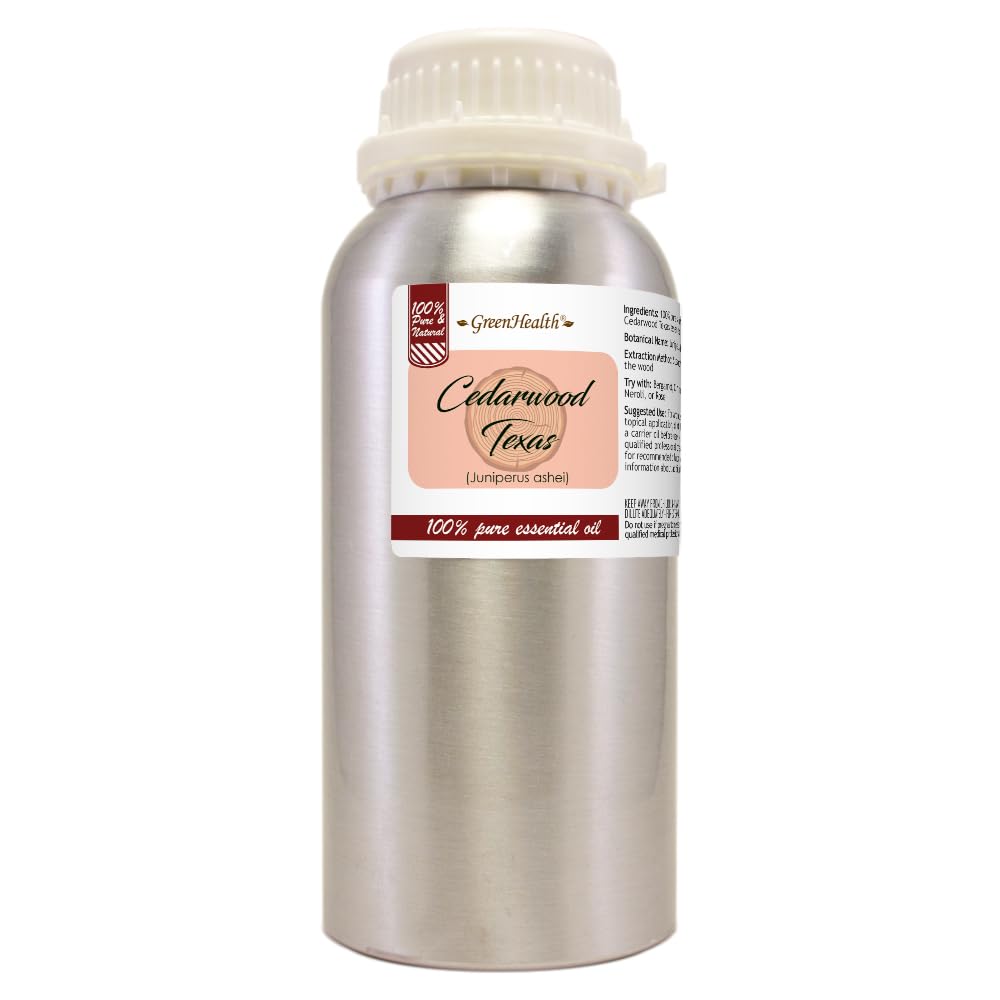 Cedarwood (Texas) Essential Oil – 16 fl oz – Aluminum Bottle w Locking Cap – 100 Pure Natural – GreenHealthBring the warm, grounding essence of GreenHealth Cedarwood (Texas) Essential Oil into your home. Steam-distilled from the wood of Juniperus mexicana, this 100 pure and natural essential oil features a rich, woody aroma perfect for aromatherapy, DIY projects, and natural home care.Key Benefits:✓ Rich, Earthy Aroma – Creates a relaxing and grounding atmosphere.✓ Versatile for DIY Projects – Ideal for making candles, soaps, room sprays, and air fresheners.✓ Home Freshening Properties – Perfect for adding to cleaning solutions and air purifiers.✓ 100 Pure Undiluted – Free from synthetic additives, fillers, or chemicals.Product Details: Size: 16 fl oz Packaging: Durable aluminum bottle to protect against light and oxidation. Locking Cap: Leak-proof design for secure storage and travel. Sustainably Sourced: Responsibly harvested to ensure purity and quality.How to Use: Aromatherapy: Add a few drops to a diffuser to create a warm, grounding atmosphere. DIY Creations: Blend into homemade candles, soaps, and natural air fresheners. Massage Skincare: Dilute with a carrier oil for a rich, woody scent. Home Freshening: Mix with water or vinegar for a natural cleaning solution.Enhance your home and wellness routine with the pure, natural power of GreenHealth Cedarwood (Texas) Essential Oil!