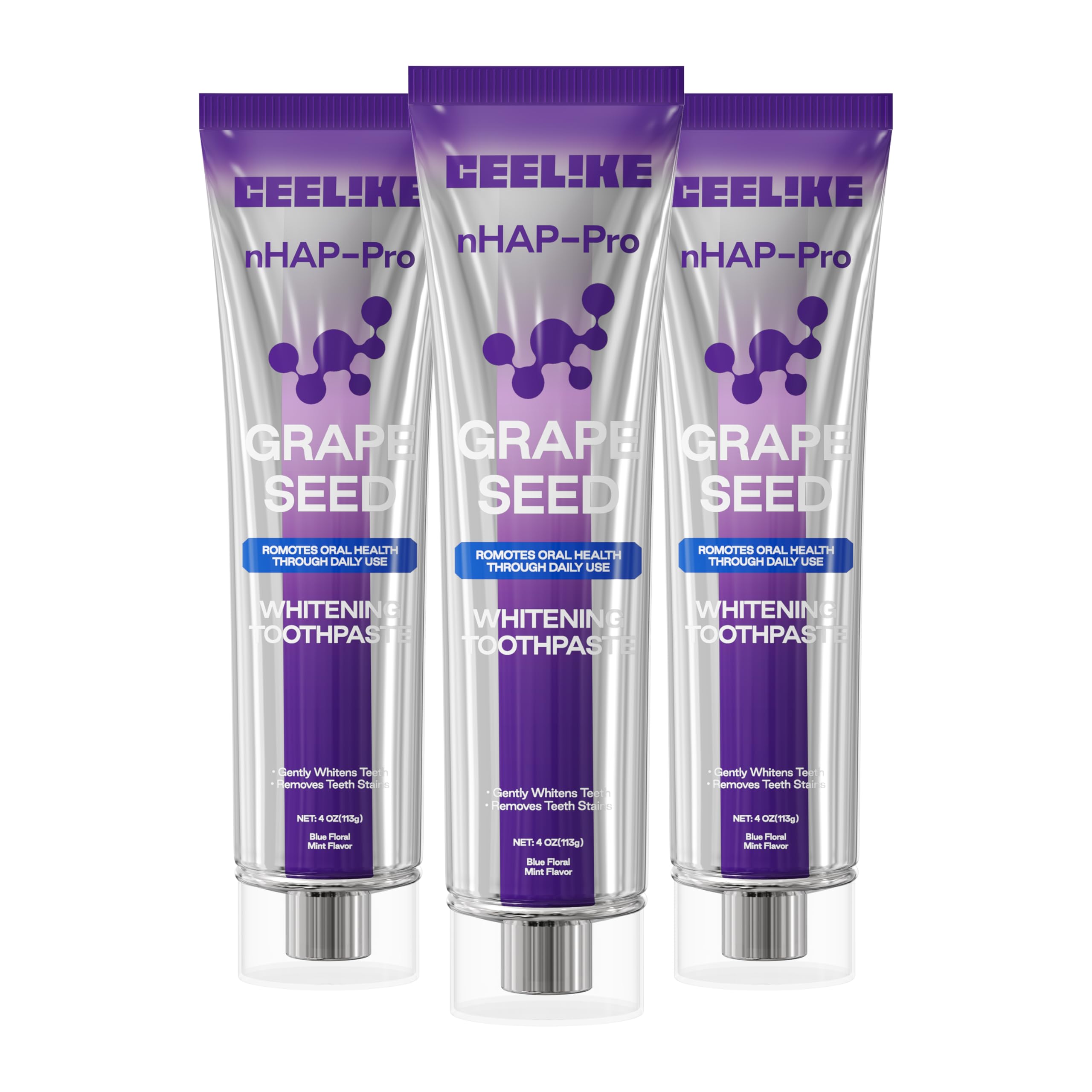 CEELIKE toothpaste combines grape seed extract with purple color correcting technology and nano hydroxyapatite (nHAP) in a fluoride-free and peroxide-free toothpaste formula. Designed for daily oral care, this whitening toothpaste delivers a gentle, refreshing brushing experience while fitting seamlessly into everyday toothpaste routines.