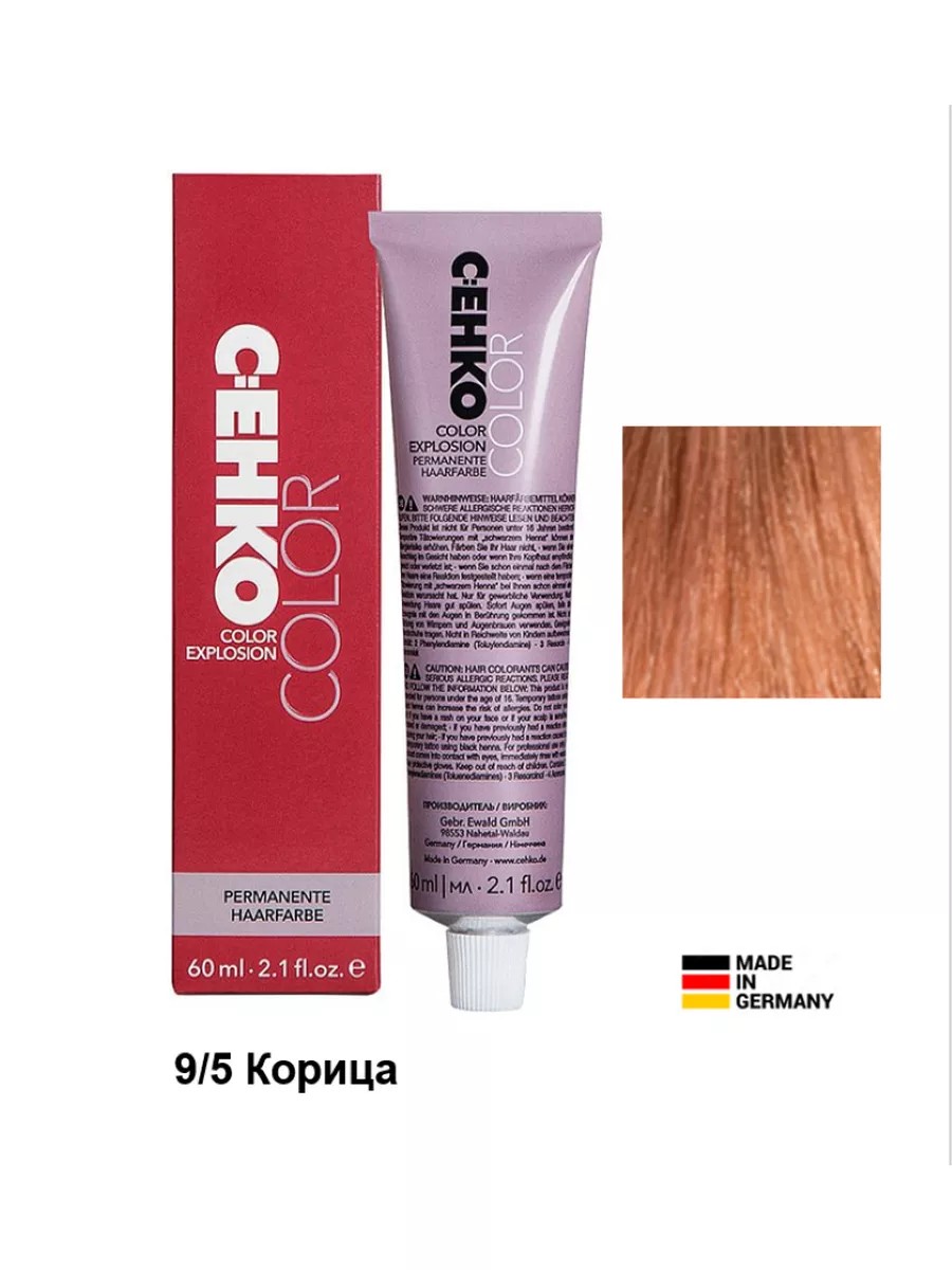 Крем-краска для профессионального окрашивания волос Cehko Color, Color Explosion 60 ml Профессиональная линия красок Cehko (C:EHKO, C:ehko), оттенок 9/5 Корица (Cinnamon, Zimt) Деликатно подобранная формула обогащена натуральными компонентами, такими как масло жожоба, креатин и миндальный протеин, так же содержит витамин С и ненасыщенные жирные кислоты. Натуральные ингредиенты оказывают укрепляющее действие на структуру локонов, ухаживает за волосами во время окрашивания. Они помогают не только получить яркий и насыщенный цвет, но и выровнять структуру волос. Крем-краска с легкостью покрывает 100 % седых волос. Продукт очень удобен в применении и обладает широкой палитрой - более 120 оттенков, насыщенных, стойких и богатых оттенков. Уровень – РН 9,5-11,5. Не содержит микропластик.