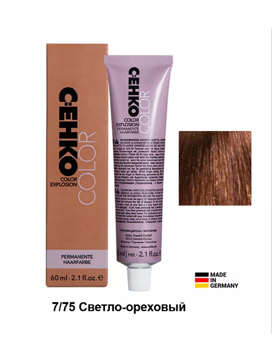 Крем-краска для профессионального окрашивания волос Cehko Color, Color Explosion 60 ml Профессиональная линия красок Cehko (C:EHKO, C:ehko), оттенок 7/75 Светло-ореховый (Light Nut Tree).Деликатно подобранная формула обогащена натуральными компонентами, такими как масло жожоба, креатин и миндальный протеин, так же содержит витамин С и ненасыщенные жирные кислоты. Натуральные ингредиенты оказывают укрепляющее действие на структуру локонов, ухаживает за волосами во время окрашивания. Они помогают не только получить яркий и насыщенный цвет, но и выровнять структуру волос. Крем-краска с легкостью покрывает 100 % седых волос. Продукт очень удобен в применении и обладает широкой палитрой - более 120 оттенков, насыщенных, стойких и богатых оттенков. Уровень – РН 9,5-11,5. Не содержит микропластик.