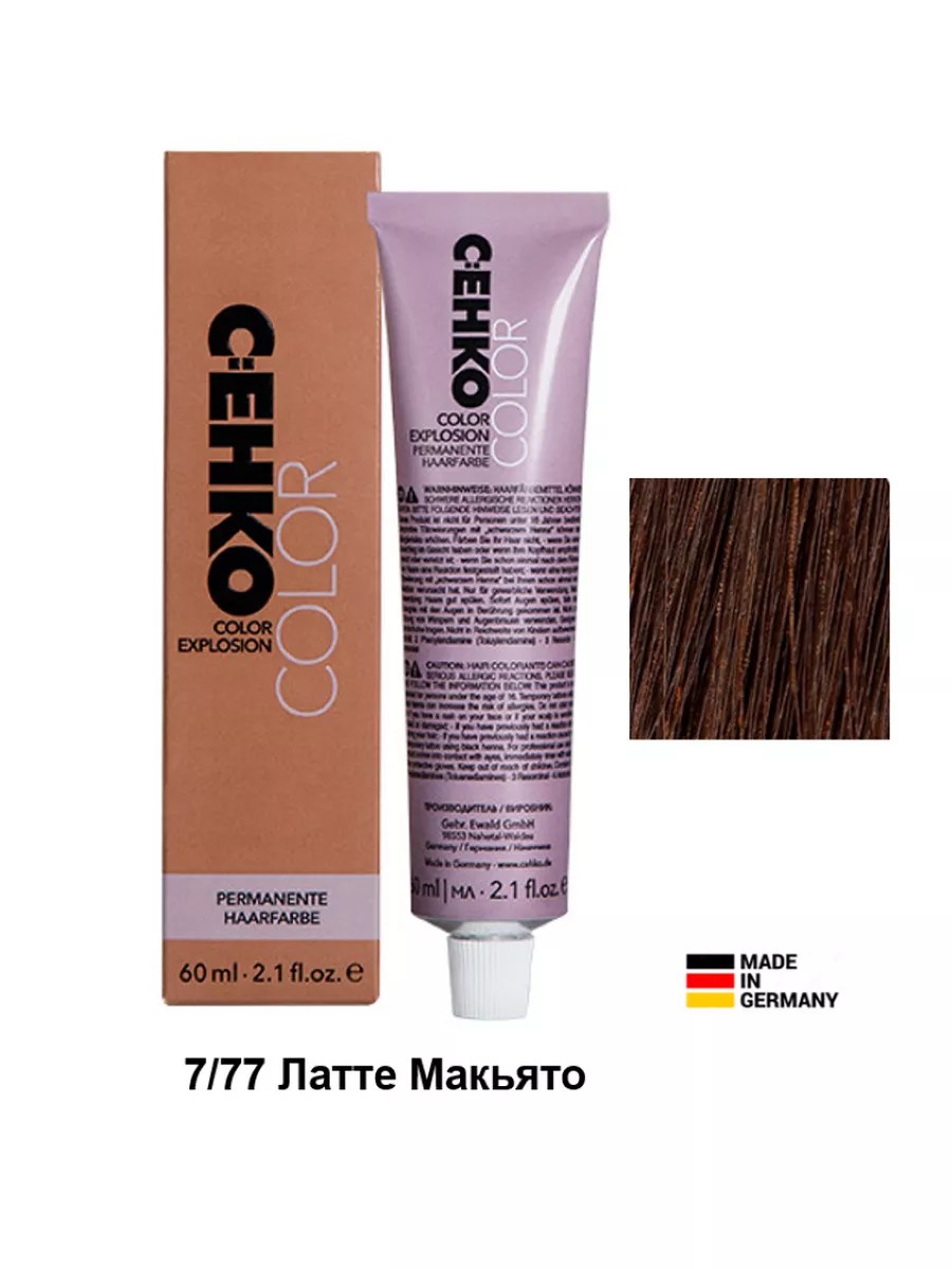 Крем-краска для профессионального окрашивания волос Cehko Color, Color Explosion 60 ml Профессиональная линия красок Cehko (C:EHKO, C:ehko), оттенок 7/77 Латте Макиато Латте Макьято (Latte Macchiato).Деликатно подобранная формула обогащена натуральными компонентами, такими как масло жожоба, креатин и миндальный протеин, так же содержит витамин С и ненасыщенные жирные кислоты. Натуральные ингредиенты оказывают укрепляющее действие на структуру локонов, ухаживает за волосами во время окрашивания. Они помогают не только получить яркий и насыщенный цвет, но и выровнять структуру волос. Крем-краска с легкостью покрывает 100 % седых волос. Продукт очень удобен в применении и обладает широкой палитрой - более 120 оттенков, насыщенных, стойких и богатых оттенков. Уровень – РН 9,5-11,5. Не содержит микропластик.