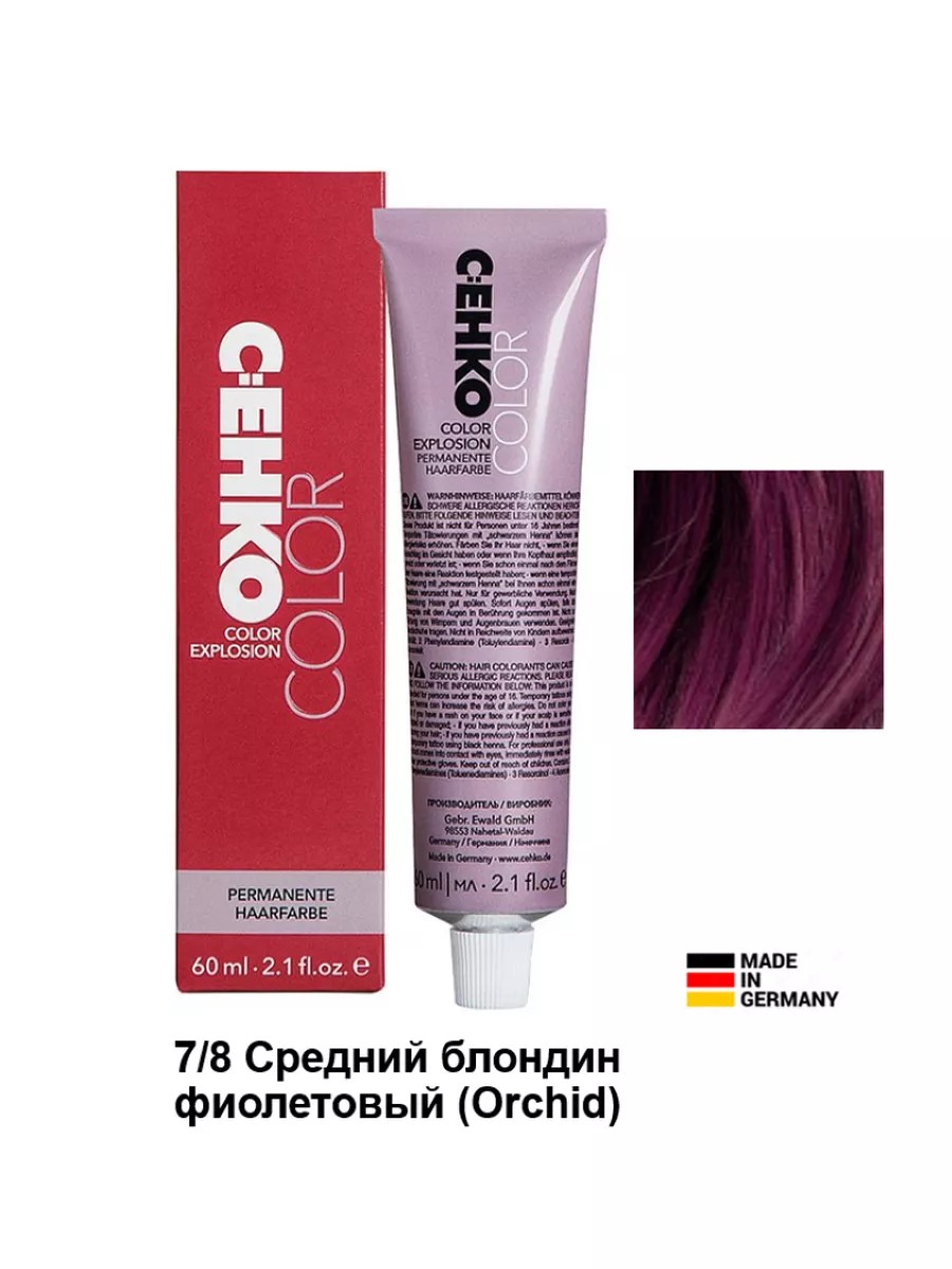 Профессиональная линия красок Cehko (C:EHKO, C:ehko), оттенок 7/8 Орхидея (Средний блондин фиолетовый) (Orchid, Orchidee).Деликатно подобранная формула обогащена натуральными компонентами, такими как масло жожоба, креатин и миндальный протеин, так же содержит витамин С и ненасыщенные жирные кислоты. Натуральные ингредиенты оказывают укрепляющее действие на структуру локонов, ухаживает за волосами во время окрашивания. Они помогают не только получить яркий и насыщенный цвет, но и выровнять структуру волос. Крем-краска с легкостью покрывает 100 % седых волос. Продукт очень удобен в применении и обладает широкой палитрой - более 120 оттенков, насыщенных, стойких и богатых оттенков. Уровень – РН 9,5-11,5. Не содержит микропластик.