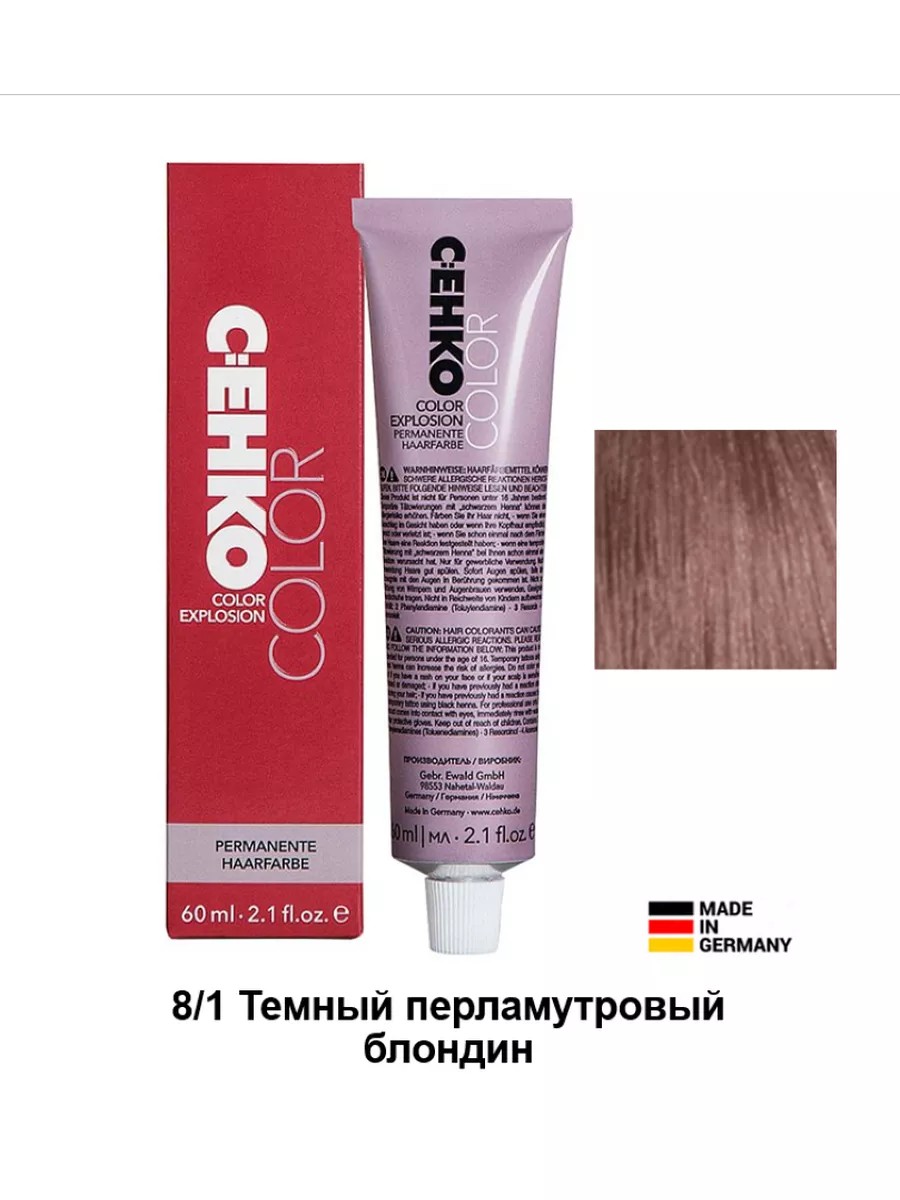 Крем-краска для профессионального окрашивания волос Cehko Color, Color Explosion 60 ml Профессиональная линия красок Cehko (C:EHKO, C:ehko), оттенок 8/1 Тёмно-перламутровый блондин (Dark Pearl Blond, Dunkelperlblond).Деликатно подобранная формула обогащена натуральными компонентами, такими как масло жожоба, креатин и миндальный протеин, так же содержит витамин С и ненасыщенные жирные кислоты. Натуральные ингредиенты оказывают укрепляющее действие на структуру локонов, ухаживает за волосами во время окрашивания. Они помогают не только получить яркий и насыщенный цвет, но и выровнять структуру волос. Крем-краска с легкостью покрывает 100 % седых волос. Продукт очень удобен в применении и обладает широкой палитрой - более 120 оттенков, насыщенных, стойких и богатых оттенков. Уровень – РН 9,5-11,5. Не содержит микропластик.
