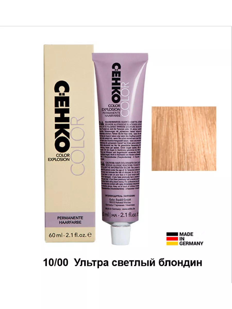 Профессиональная линия красок Cehko (C:EHKO, C ehko), оттенок 10/00 Ультра-светлый блондин (Ultra Light Blond, Ultrahellblond) Деликатно подобранная формула обогащена натуральными компонентами, такими как масло жожоба, креатин и миндальный протеин, так же содержит витамин С и ненасыщенные жирные кислоты. Натуральные ингредиенты оказывают укрепляющее действие на структуру локонов, ухаживает за волосами во время окрашивания. Они помогают не только получить яркий и насыщенный цвет, но и выровнять структуру волос. Крем-краска с легкостью покрывает 100 % седых волос. Продукт очень удобен в применении и обладает широкой палитрой - более 120 оттенков, насыщенных, стойких и богатых оттенков. Уровень – РН 9,5-11,5. Не содержит микропластик.