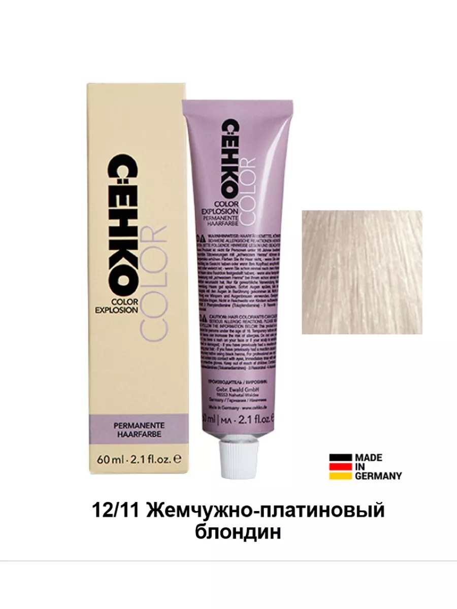 Профессиональная линия красок Cehko (C:EHKO, C:ehko), оттенок 12/11 Жечужно-платиновый блондин (Platinum Blond Pearl, Platinblond Perle) Деликатно подобранная формула обогащена натуральными компонентами, такими как масло жожоба, креатин и миндальный протеин, так же содержит витамин С и ненасыщенные жирные кислоты. Натуральные ингредиенты оказывают укрепляющее действие на структуру локонов, ухаживает за волосами во время окрашивания. Они помогают не только получить яркий и насыщенный цвет, но и выровнять структуру волос. Крем-краска с легкостью покрывает 100 % седых волос. Продукт очень удобен в применении и обладает широкой палитрой - более 120 оттенков, насыщенных, стойких и богатых оттенков. Уровень – РН 9,5-11,5. Не содержит микропластик.