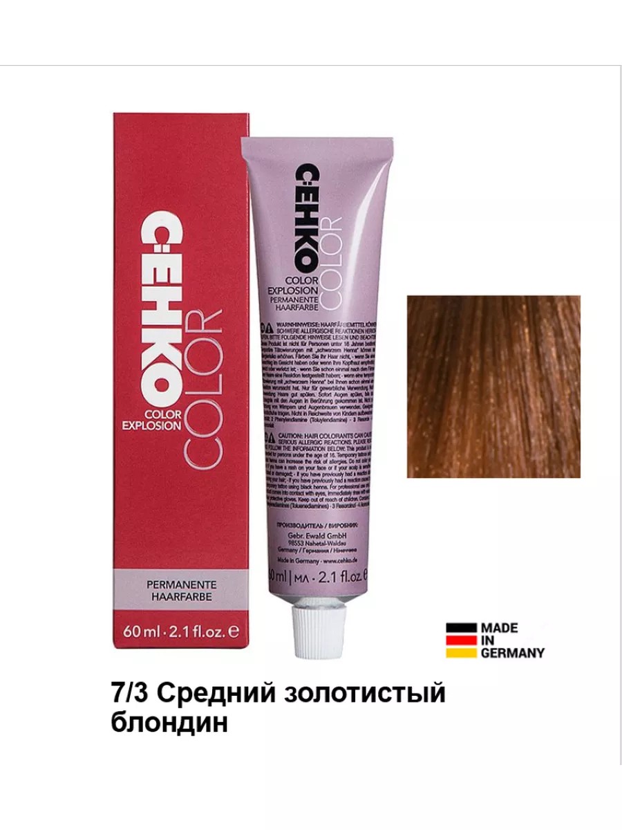 Профессиональная линия красок Cehko (C:EHKO, C:ehko), оттенок 7/3 Средний золотистый блондин (Medium Golden Blond, Mittelgoldblond). Деликатно подобранная формула обогащена натуральными компонентами, такими как масло жожоба, креатин и миндальный протеин, так же содержит витамин С и ненасыщенные жирные кислоты. Натуральные ингредиенты оказывают укрепляющее действие на структуру локонов, ухаживает за волосами во время окрашивания. Они помогают не только получить яркий и насыщенный цвет, но и выровнять структуру волос. Крем-краска с легкостью покрывает 100 % седых волос. Продукт очень удобен в применении и обладает широкой палитрой - более 120 оттенков, насыщенных, стойких и богатых оттенков. Уровень – РН 9,5-11,5. Не содержит микропластик.