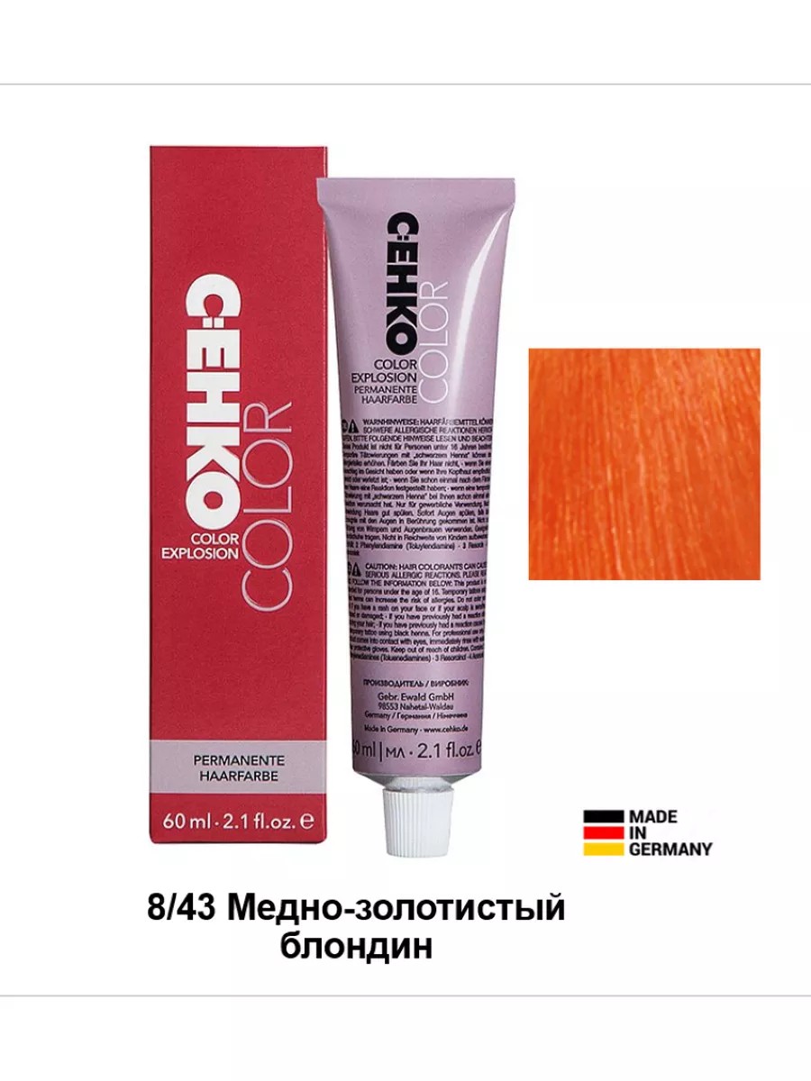 Крем-краска для профессионального окрашивания волос Cehko Color, Color Explosion 60 ml Профессиональная линия красок Cehko (C:EHKO, C:ehko), оттенок 8/43 Медно-золотистый блондин (Golden Copper Blond, Kupfergoldblond) Деликатно подобранная формула обогащена натуральными компонентами, такими как масло жожоба, креатин и миндальный протеин, так же содержит витамин С и ненасыщенные жирные кислоты. Натуральные ингредиенты оказывают укрепляющее действие на структуру локонов, ухаживает за волосами во время окрашивания. Они помогают не только получить яркий и насыщенный цвет, но и выровнять структуру волос. Крем-краска с легкостью покрывает 100 % седых волос. Продукт очень удобен в применении и обладает широкой палитрой - более 120 оттенков, насыщенных, стойких и богатых оттенков. Уровень – РН 9,5-11,5. Не содержит микропластик.