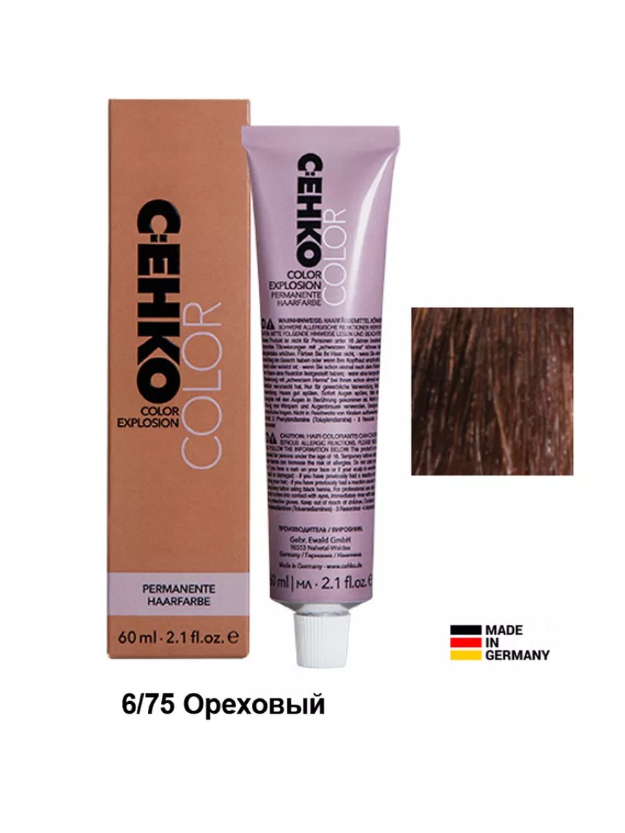 Cehko Color Professional Hair Coloring Cream, Color Explosion 60 ml Professional hair color line Cehko (C:EHKO, C:ehko), shade 6/75 Nut Tree. The carefully selected formula is enriched with natural ingredients such as jojoba oil, creatine, and almond protein, and also contains vitamin C and unsaturated fatty acids. Natural ingredients strengthen the hair structure and care for the hair during coloring. They help not only achieve a bright and rich color but also even out the hair structure. The cream color easily covers 100% of gray hair. The product is very easy to use and has a wide palette - more than 120 shades, rich, long-lasting, and saturated. Level - pH 9.5-11.5. Does not contain microplastics.