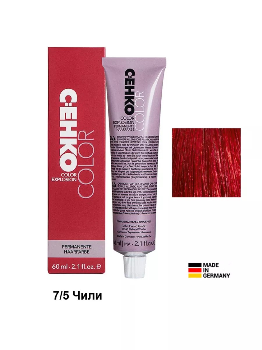 Крем-краска для профессионального окрашивания волос Cehko Color, Color Explosion 60 ml Профессиональная линия красок Cehko (C:EHKO, C:ehko), оттенок 7/5 Чили (Chili).Деликатно подобранная формула обогащена натуральными компонентами, такими как масло жожоба, креатин и миндальный протеин, так же содержит витамин С и ненасыщенные жирные кислоты. Натуральные ингредиенты оказывают укрепляющее действие на структуру локонов, ухаживает за волосами во время окрашивания. Они помогают не только получить яркий и насыщенный цвет, но и выровнять структуру волос. Крем-краска с легкостью покрывает 100 % седых волос. Продукт очень удобен в применении и обладает широкой палитрой - более 120 оттенков, насыщенных, стойких и богатых оттенков. Уровень – РН 9,5-11,5. Не содержит микропластик.
