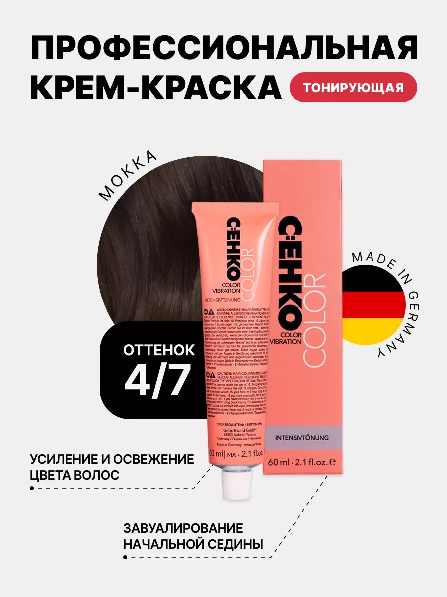 "Профессиональное косметическое средство C:EHKO (Цеко) COLOR VIBRATION - крем - краска для волос без аммиака 4/7 Мокка / Mokka цвет. Это идеальное решение для тонирования и окрашивания, для освежения цвета между окрашиваниями, а также можно подчеркнуть натуральный оттенок волос. Благодаря стойкой формуле, она позволяет не только изменить цвет волос, но и обеспечить бережный уход.