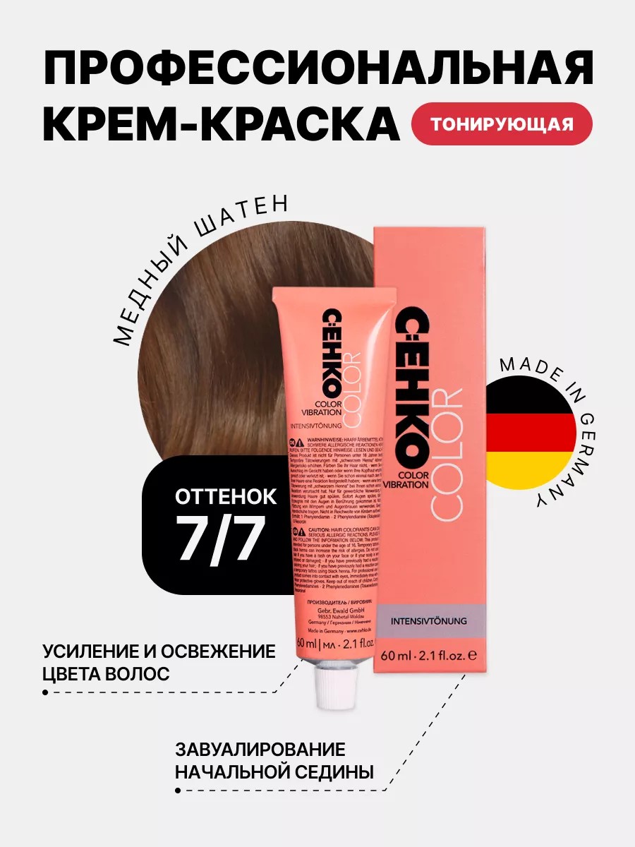 "Профессиональное косметическое средство C:EHKO (Цеко) COLOR VIBRATION - крем - краска для волос без аммиака 7/7 Медный шатен цвет. Это идеальное решение для тонирования и окрашивания, для освежения цвета между окрашиваниями, а также можно подчеркнуть натуральный оттенок волос. Благодаря стойкой формуле, она позволяет не только изменить цвет волос, но и обеспечить бережный уход.
