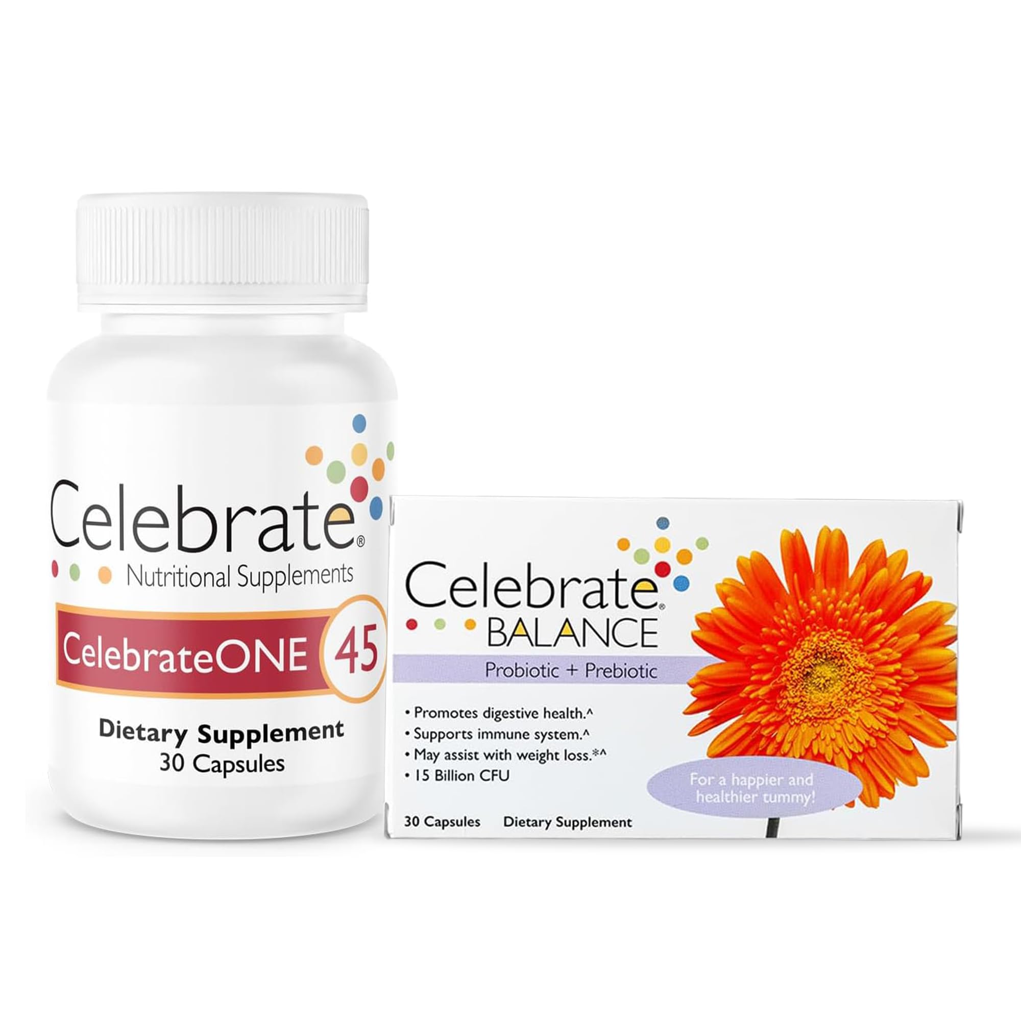 Support your post-bariatric surgery journey with the CelebrateONE 45 Multivitamin and Balance Probiotic Prebiotic Capsules Bundle. CelebrateONE 45 delivers a complete, once-daily multivitamin featuring 22 essential nutrients, including 45mg of iron as ferrous fumarate, tailored for individuals who need to replenish and maintain iron levels. Superior forms of vitamins and chelated minerals ensure optimal absorption, while the absence of calcium prevents interference with iron uptake. Balance Probiotic Prebiotic Capsules complement this by promoting digestive health with 28.5 billion CFUs from five powerful probiotic strains. Prebiotics feed these beneficial bacteria, supporting a vibrant and balanced gut flora. Together, these supplements provide the ultimate support for nutrient absorption, digestion, and recovery. Specifically designed for bariatric patients, this bundle simplifies your routine while delivering essential health benefits. Celebrate Vitamins products are made in GMP-certified facilities, meet ASMBS guidelines, and are gluten-free, sugar-free, and artificial color-free. Enhance your health and wellness with Celebrate's trusted and effective supplements!Trusted Quality Safety: Celebrate Vitamins adheres to the highest standards, meeting or exceeding ASMBS guidelines and manufacturing in GMP-certified facilities in the USA. Gluten-free, sugar-free, and made with premium ingredients, these supplements ensure safe, effective, and reliable post-surgery support. Celebrate over 15 years of commitment to helping bariatric patients thrive. Tailored for Bariatric Patients: Specifically designed for individuals recovering from gastric bypass, sleeve gastrectomy, or adjustable gastric band procedures, this bundle supports optimized nutrient intake and gut health. It addresses the unique needs of bariatric patients by enhancing vitamin and mineral absorption and maintaining a thriving digestive system, even in a low-acid environment. Potent Probiotic Prebiotic Formula: Balance Capsules contain 28.5 billion CFUs from five strains of beneficial probiotics, promoting a healthy gut flora balance. Added prebiotics nourish these probiotics, supporting digestion, nutrient absorption, and overall gut health. Ideal for bariatric patients, this combination ensures digestive harmony and enhanced nutrient uptake, essential for post-surgery recovery. Complete Multivitamin with 45mg Iron: CelebrateONE 45 provides 22 essential vitamins and minerals in one easy-to-swallow capsule, including 45mg of iron to replenish and maintain iron levels. Formulated for post-bariatric surgery needs, it offers superior absorption of critical nutrients like vitamins A, D, E, and chelated minerals. The absence of calcium ensures no interference with iron absorption, making this multivitamin a trusted choice for long-term health. Comprehensive Post-Bariatric Support: This bundle combines CelebrateONE 45 Multivitamin with Iron and Balance Probiotic Prebiotic Capsules to deliver vital nutrition and digestive health support for bariatric surgery patients. Designed to simplify your post-surgery regimen, these supplements ensure you get the essential vitamins, minerals, and digestive support needed for recovery and wellness.