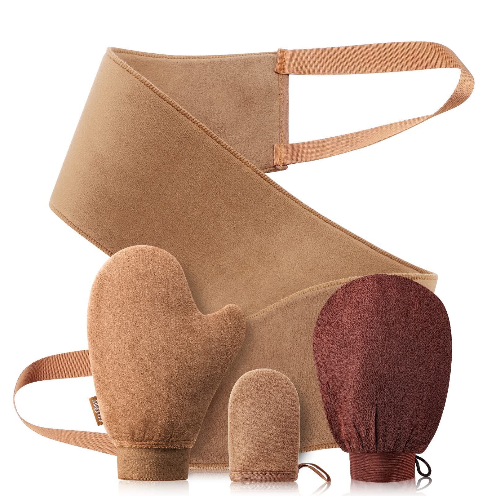 ?Durability and Washable?CeleCily sunless tanner mitt set are carefully sewn together with the highest quality stitch construction. This creates our tanning applicator set which will outlast any self tanner glove on the market in durability. Moreover, our self tan applicator set can be hand-washed with warm water or machine wash after use, and hung it to dry. BTW washing will not lose its softness, making it a dream of repeated use. ?Soft&Skin-friendly?Using velvet as the outer fabric of the spray tan mitt, it's very soft and skin-friendly. It will effortlessly blend the lotion on your skin to achieve a really smooth, evenly, STREAK-FREE tone. ?No More Orange Hands?CeleCily self tanner mitt and mini mitt have a high quality water-proof isolating layer on the inner side, prevents the tanning lotions into the mitt when applying, and no leak-through problem. ?Full Body 4-in-1 Tanning Gloves Set?The CeleCily tanning mitt applicator set covers all the applicators you need when applying tanning lotions. Our mitt set includes 1 exfoliating glove, 1 self tan mitt applicator, 1 mini self tanner applicator, and 1 back lotion applicator for back, no matter apply the details or your back, you can do it all by yourself, achieve to the real self tanning like a pro.