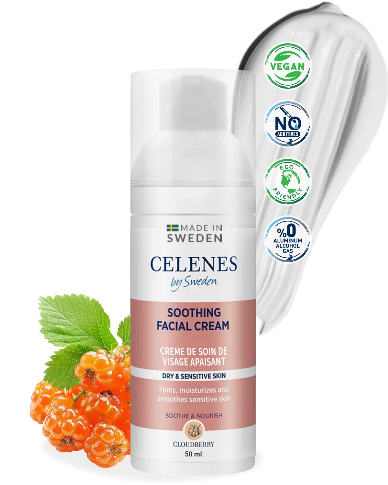 Celenes by Sweden Cloudberry Soothing Face Cream for Dry & Sensitive Skin Nourishing Birch Extract & Vitamin B/C Free from Alcohol Silicones Parabens & Mineral Oil - 50 ml