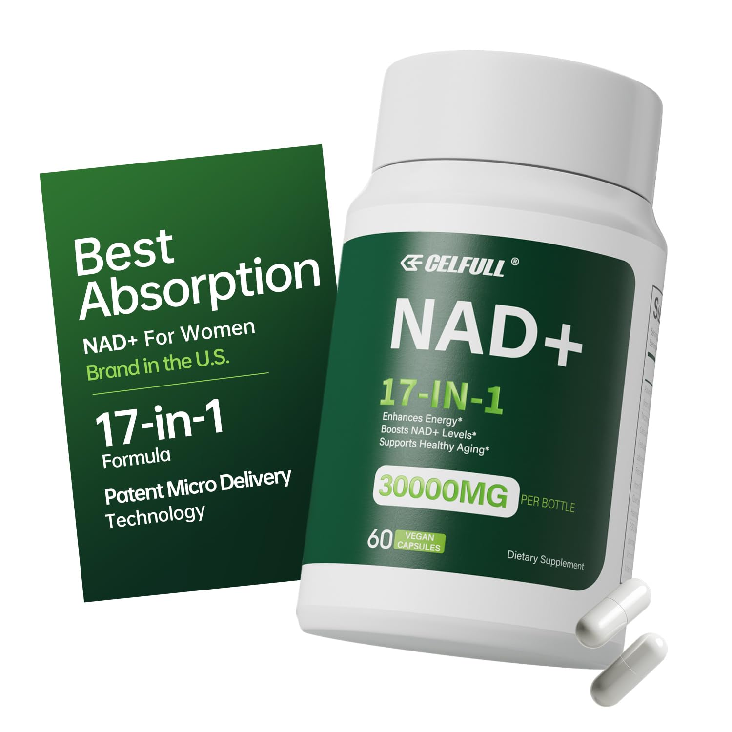 [Excellence Secured]Delight in our NAD Supplement capsules, meticulously formulated with premium natural ingredients and rigorously assessed for purity. With our unwavering 100 satisfaction guarantee, your contentment is our priority. [Revitalize with Clean Energy]Our NADH, Nicotinamide Riboside, and Resveratrol supplement offers convenient anti-aging support. Easy-to-swallow capsules are allergen and gluten-free, with no taste or odor. Experience clean energy without jitters or sleep disruptions - it may even enhance sleep quality. [17-in-1 Compound Supplement] CELFULL NADH is a powerful 17-in-1 compound supplement that includes key ingredients NADH Micro, Nicotinamide Riboside, Ashwagandha and Resveratrol. Additional Nutrients: PQQ, Quercetin, Haematococcus Pluvialis Extract, Vitamin C, and Vitamin D, Niacin, Vitamin B1,Vitamin B2,Vitamin B6, Folate,Vitamin B12, Biotin, Pantothnate Acid. [Revolutionary Microsphere Technology for Optimal Absorption] In the realm of NAD supplementation, absorption reigns supreme. CELFULL NAD harnesses cutting-edge patented microsphere technology, meticulously crafted to elevate the absorption of NAD within your system. This pioneering methodology guarantees unparalleled absorption levels, empowering you to unlock the full potential of the supplement and reap its maximum benefits. [Promote Healthy Aging with CELFULL NAD ] NAD (Nicotinamide Adenine Dinucleotide) serves as a vital coenzyme essential for numerous biological functions, such as DNA repair, energy generation, and cellular metabolism. With age, the natural decline in NAD levels leads to decreased energy, cognitive abilities, and overall vigor. CELFULL NAD has been meticulously crafted to elevate NAD levels, empowering you to combat weariness and support graceful aging.