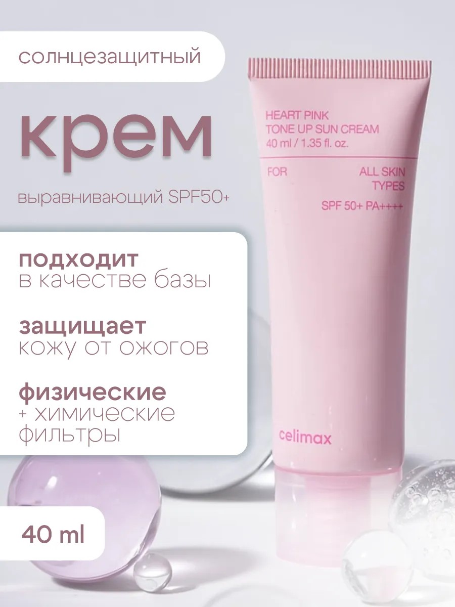 Выравнивающий солнцезащитный крем для сияния кожи Heart Pink Tone Up Sun Cream SPF50+ PA++++ 40 мл. выравнивает тон, устраняет тусклость и землистый цвет лица. Защищает кожу от появления солнечных ожогов, пигментных пятен и фотостарения. Подходит в качестве базы под макияж.