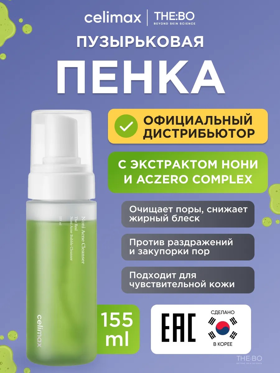 Celimax The Real Noni Acne Bubble Cleanser — инновационная очищающая пенка с ультралегкой пузырьковой текстурой, созданная для проблемной кожи и ежедневного умывания. Особенность средства для умывания — экстракт нони, богатый антиоксидантами, который защищает кожу и борется с несовершенствами, такими как акне, угри и черные точки.