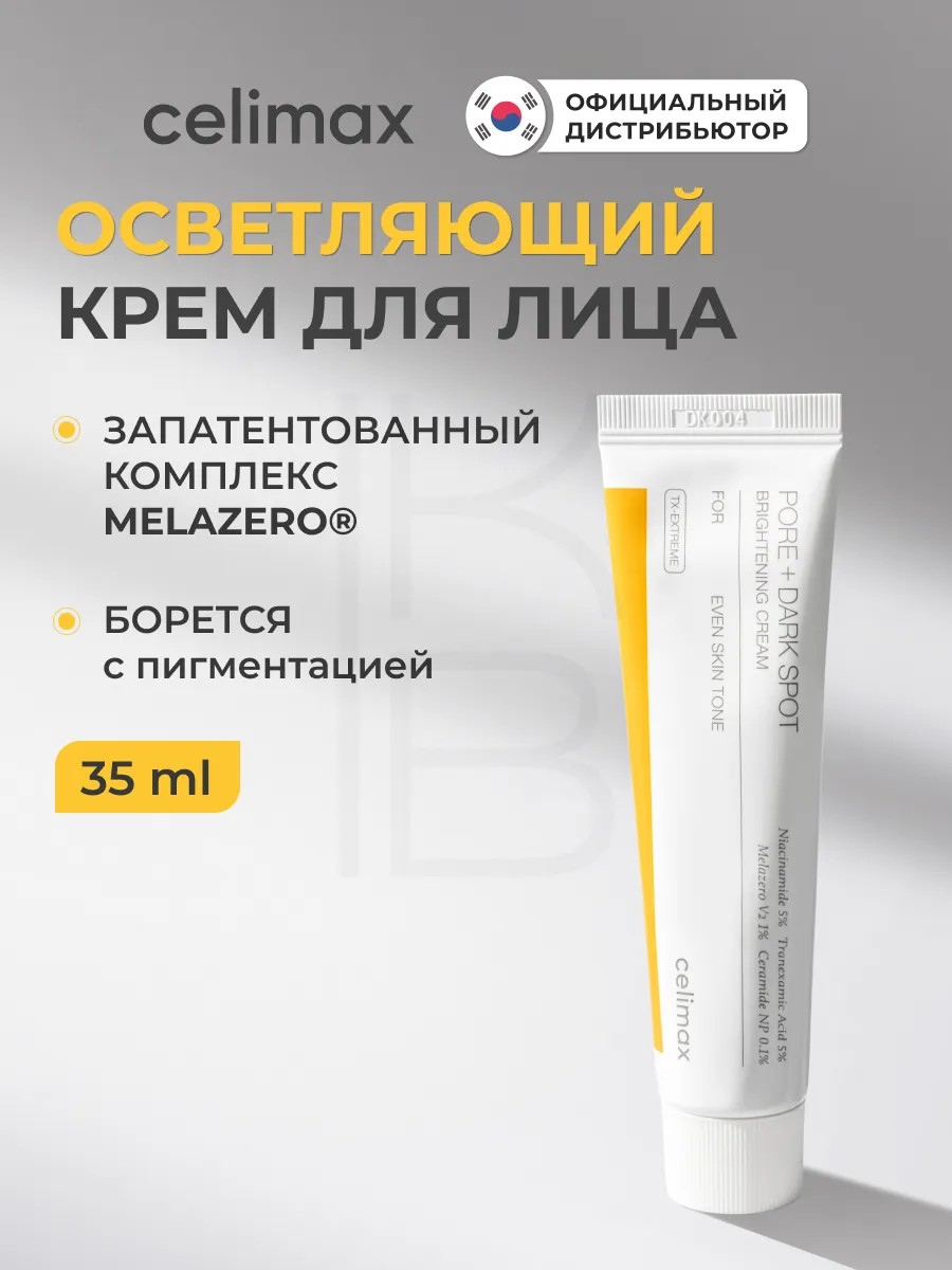 Celimax Pore+Dark Spot Brightening Cream 35 мл — осветляющий крем нового поколения для сияния и молодости кожи. Он помогает избавиться от пигментации, постакне, расширенных пор и неровного рельефа. Особенно эффективно средство работает в зоне «бабочки» — на лбу, носу и щеках, где чаще всего остаются следы акне и последствия солнца.