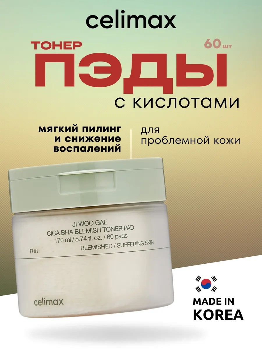 Пэды Celimax Ji Woo Gae Cica BHA Blemish Toner Pad профессиональный уход для кожи из Кореи, совмещающий тонер, пилинг и маску в формате удобных дисков, мягко отшелушивая омертвевшие клетки и очищая поры от черных точек.