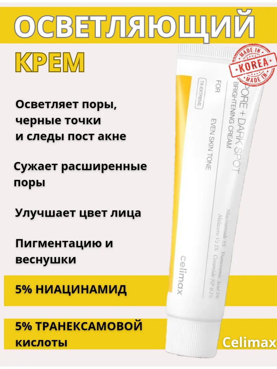 Кремпротив пигментации CelimaxPore Dark Spot Brightening Cream,сужает расширенные поры, избавляет от тусклости, придаёт гладкость и здоровое сияние. Уровень pH6.1-8.1.