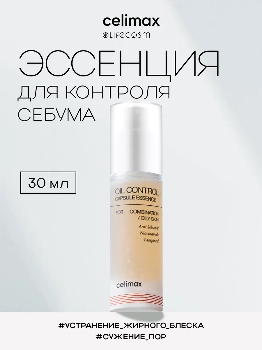 Celimax Oil Control Capsule Essence - это инновационная эссенция в капсулах, которая предназначена для контроля выработки себума, борьбы с жирным блеском кожи и сокращения выраженности пор. Эссенция для лица эффективно помогает сохранять матовость и свежесть кожи в течение дня, минимизируя количество высыпаний и других видимых несовершенств, сохраняя кожу чистой и здоровой. Состав увлажняющей эссенции богат такими активными компонентами как ниацинамид, аденозин и экстракт центеллы, которые в комплексе эффективно восстанавливают защитные функции кожи. Восстанавливающая эссенция повышает способность удержания влаги и оказывает выраженный укрепляющий и подтягивающий эффекты. А гиалуроновая кислота и экстракт камелии в составе глубоко увлажняют кожу и устраняют сухость, предотвращая преждевременное старение кожи и сохраняя её гладкость, нежность и бархатистость. Функции корейской эссенции Селимакс и её исключительная способность к улучшению текстуры кожи в целом делают её идеальной для обладателей жирной или комбинированной кожи. Приобрести эссенцию для контроля себума селимакс Вы можете в магазине оригинальной корейской косметики Lifecosm.