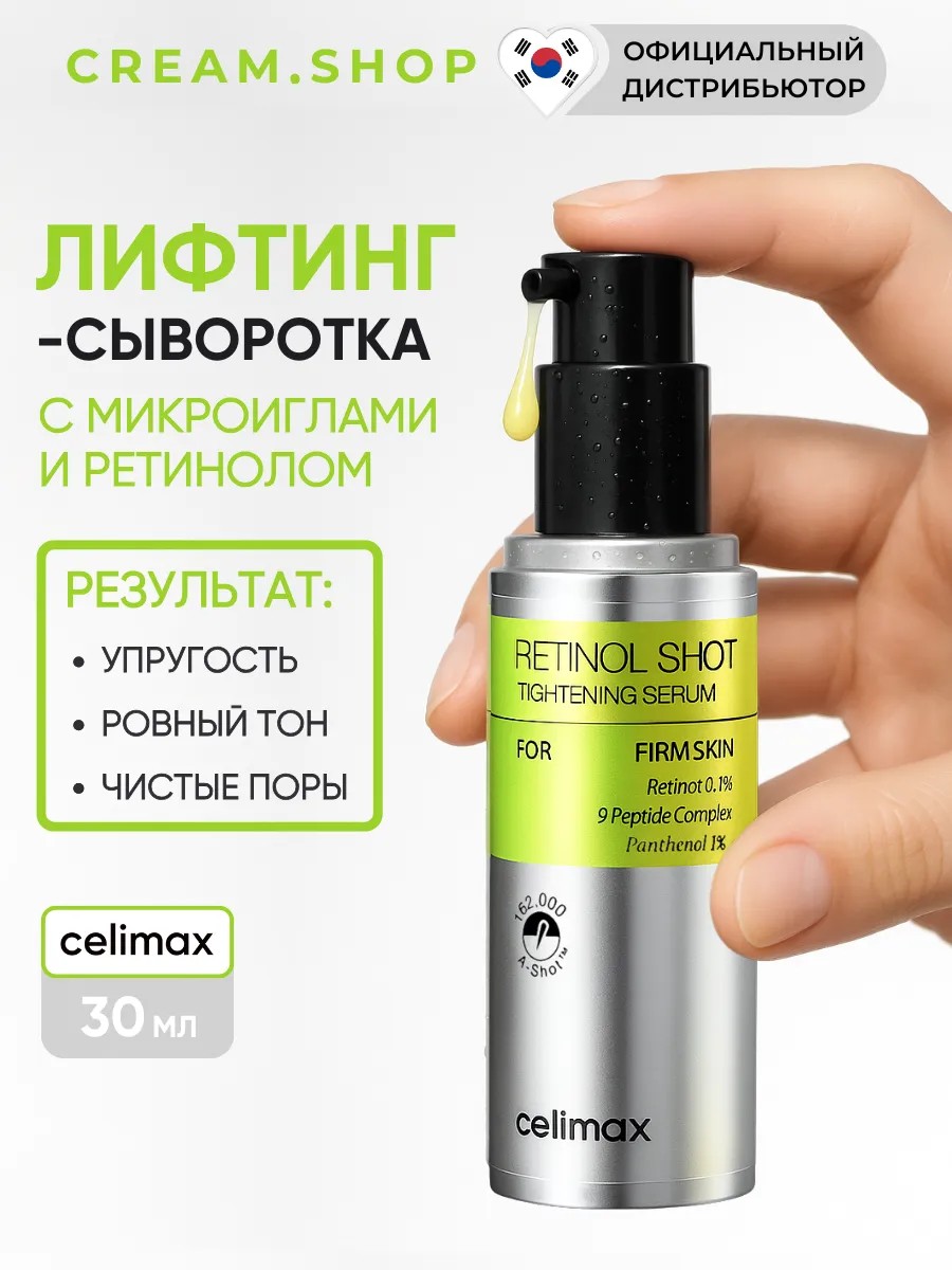 Подарите своей коже идеальное увлажнение с антивозрастной сывороткой для лица от Celimax The Vita-A Retinol Shot Tightening Serum. Celimax сыворотка — мощная корейская формула, содержащая 0,1% ретинола и 9 видов пептидов, за счёт чего обеспечивает омолаживающий эффект: помогает в борьбе с морщинами, возвращает коже молодость и упругость, помогает от расширенных пор, осветляет пигментные пятна и постакне. Продукт содержит спикулы, которые обеспечивают глубокое проникновение активных компонентов, усиливая эффект лифтинга. Сыворотка с иглами уменьшает жирный блеск, количество воспалений и комедонов, сужает поры, повышает эластичность кожи. Пантенол 1% успокаивает и восстанавливает кожу, делая ее более гладкой и увлажненной. Отлично подойдёт для проблемной и комбинированной кожи, а также для зрелой кожи 50 +. Лёгкая текстура продукта подойдёт даже жирной коже. Это идеальный подарок для женщины на день рождения или любой другой праздник. Уход за кожей станет ещё эффективнее с качественной корейской косметикой Celimax.