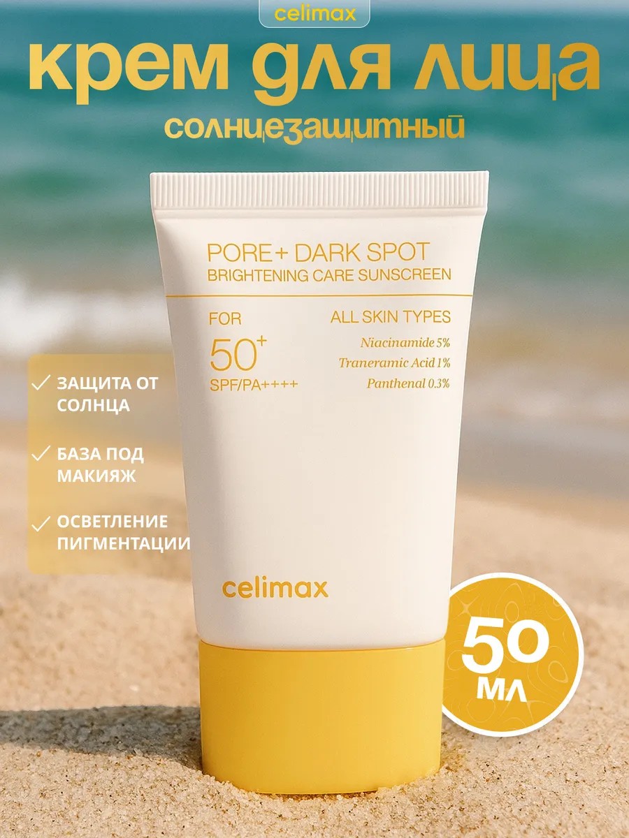 Солнцезащитный крем для сияния кожи Celimax Pore+Dark Spot Brightening Care Sunscreen SPF 50+ PA++++ оберегает кожу от солнечных лучей, создан на химических фильтрах нового поколения (Diethylamino Hydroxybenzoyl Hexyl Benzoate, Ethylhexyl Triazone, Methylene Bis-Benzotriazolyl Tetramethylbutylphenol, Diethylhexyl Butamido Triazone), они не раздражают кожу, имеют высочайший фактор защиты от ультрафиолета, являются фотостабильными не требуют обновления каждые 2 часа. Транексамовая кислота в составе осветляет кожу, блокирует синтез меланина, предотвращает появление пигментации, также имеет противовоспалительные свойства.