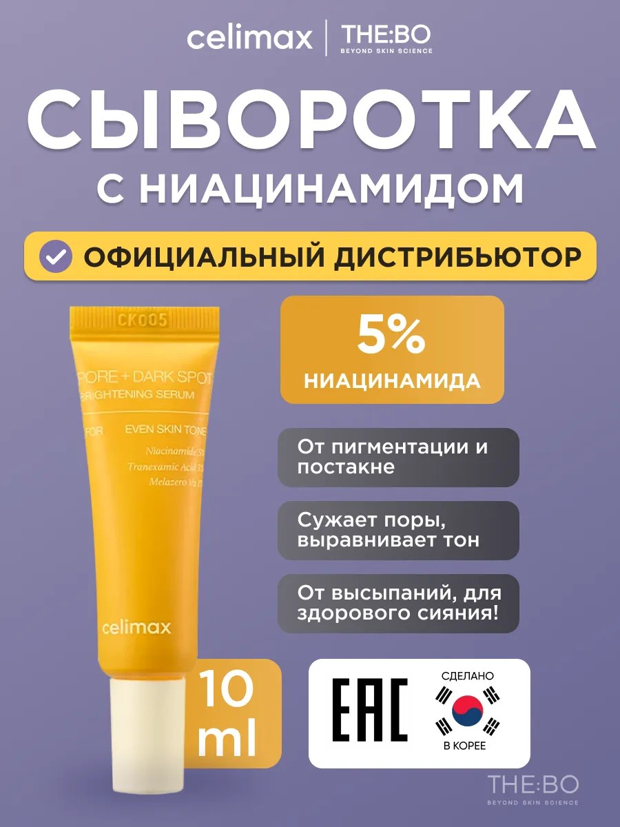 Миниатюра сыворотки Celimax Pore+Dark Spot Brightening Serum для ухода за кожей эффективно улучшает общий тон, мягко осветляет пигментацию и постакне, устраняя тусклость. Уникальная формула способствует восстановлению здорового сияния вашей кожи, не оставляя липкости и обеспечивая приятное ощущение свежести при нанесении. Витаминная увлажняющая сыворотка подходит для всех типов кожи благодаря уровню pH 5.9-7.9. Она помогает выравнивать текстуру, сужать расширенные поры, сглаживать микрорельеф и осветлять сальные нити.