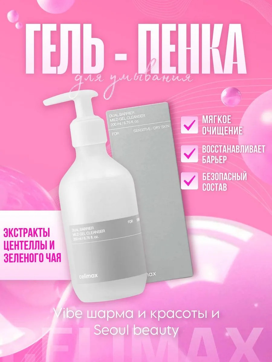 Нежный гель-пенка для умывания с комплексом церамидов Celimax Dual Barrier Mild Gel Cleanser мягко очищает кожу не нарушая её барьерных функций и не повреждая липидный слой. Продукт на основе растительных ПАВов деликатно удаляет все загрязнения, остатки кожного сала и макияжа, идеально подходит для сухой и чувствительной кожи.