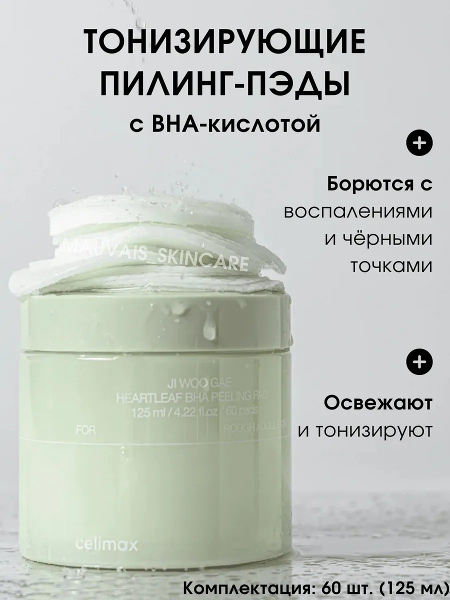 Пилинг пэды Celimax Ji Woo Gae Heartleaf BHA Peelind Pad прекрасно очищают, избавляют от жирного блеска, борются с воспалениями и чёрными точками, освежают и тонизируют.