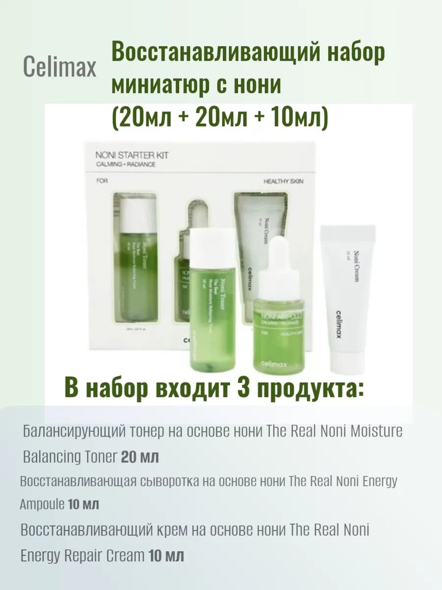 Корейский набор миниатюр для лица Celimax The Real Noni Starter Kit содержит хиты бренда – линейку с нони, тропическим суперфудом, который завоевал индустрию косметики по уходу за кожей. Средства имеют гипоаллергенные формулы за счёт компонентов, имеющих класс безопасности EWG Green. Набор обеспечивает комплексный уход: тонер, сыворотка и крем питают, увлажняют и восстанавливают.Балансирующий тонер на основе нони The Real Noni Moisture Balancing Toner.Слабокислотный увлажняющий тонер с лёгкой текстурой успокаивает, питает, устраняет сухость и разглаживает текстуру кожи. Средство восстанавливает влагоудерживающий барьер и препятствует испарению влаги. Содержит 80,1% экстракта нони, аминокислоты, масло розмарина и аллантоин. Восстанавливающая сыворотка на основе нони The Real Noni Energy Ampoule ) Средство с мощным антиоксидантным действием увлажняет и смягчает, снижает чувствительность, успокаивает раздражение и зуд, укрепляет естественный защитный слой. Содержит 71,77% экстракта нони, аденозин и фитосфингозин. Восстанавливающий крем на основе нони The Real Noni Energy Repair Cream . Питательный крем с нежной плотной текстурой восстанавливает тонкую чувствительную кожу, прекрасно подходит для осенне-зимнего ухода. Средство ускоряет заживление, устраняет сухость и шелушение, избавляет от чувства стянутости. Содержит 57% экстракта нони, ниацинамид, церамиды, масло ши и аденозин. Экстракт нони питает, восстанавливает и оказывает противовоспалительное действие, успокаивает раздражение и борется с процессом окисления, поддерживая упругость и молодость кожи. Фитосфингозин – фосфолипид с антибактериальными и противовоспалительными свойствами, он ускоряет заживление и замедляет процесс старения. Церамиды, схожие с липидами эпидермиса, укрепляют гидролипидный слой, препятствует испарению влаги и проникновению вредных веществ. Аденозин стимулирует выработку коллагена, уменьшает выраженность морщин и препятствует их появлению, разглаживает.