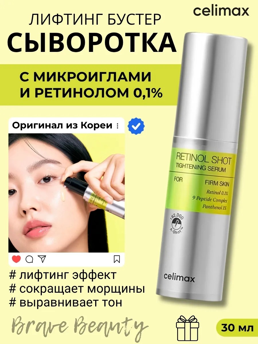 Celimax The Vita-A Retinol Shot Tightening Serum — это новейшая разработка, представляющая собой уникальную сыворотку для лица с ретинолом и микроиглами, действие которых направлено на интенсивную борьбу с возрастными изменениями и улучшение текстуры кожи. Эффективно сокращает морщины, повышает упругость и сужает поры, оказывая выраженный лифтинг эффект и делая кожу более гладкой. Формула лифтинг-сыворотки включает концентрацию чистого ретинола 0.1%, что делает ее идеальным средством для тех, кто стремится к антивозрастному уходу и улучшению качества кожи. Основным компонентом в составе является ретинол — один из самых мощных ингредиентов для борьбы с признаками старения. Ретинол стимулирует синтез коллагена, ускоряет процесс обновления клеток и сокращает глубину морщин, делая кожу более упругой и гладкой. Дополняет активное действие ретинола комплекс 9 пептидов, активные свойства которого направлены на повышение эластичнсоти и упругости кожи. Другой не менее важный компонент – спикулы (микроиглы) – основы скелета морской губки, обладающие пористой структурой, что позволяет им впитывать в себя питательные вещества и передавать их коже при дальнейшем соприкосновении. Образовывая на поверхности эпидермиса микроскопический прокол, микроиглы проникают глубоко в кожу и начинают взаимодействовать с клетками, передавая полезные элементы через собственные поры. Микроиглы имеют высокую способность к стимуляции кровообращения и разглаживанию заломов.