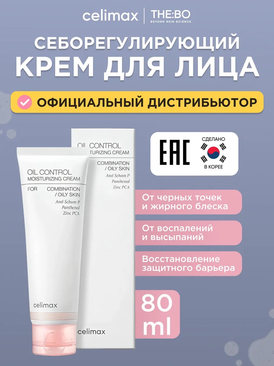 Celimax Oil Control Moisturizing Cream - инновационный продукт, разработанный специально для бережного и эффективного ухода за жирной и комбинированной кожей, помогает восстановить гидролипидный баланс кожи. Основной компонент – цинк РСА – направлен на сокращение выработки кожного сала, при этом не нарушая естественную защиту эпидермиса. Уникальный бета-глюкан обеспечивает коже оптимальный уровень увлажнения, повышая его на 28.36%, устраняя неприятное чувство стянутости.