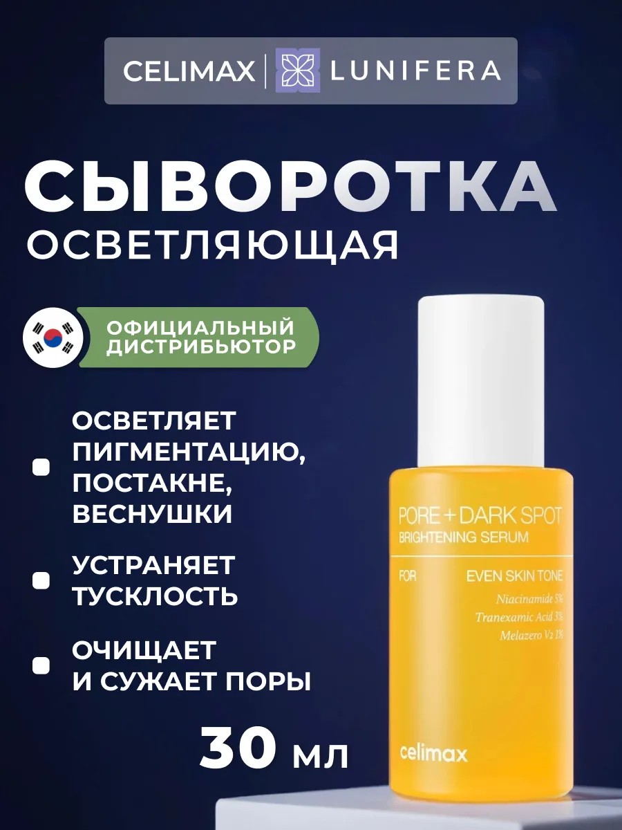 Осветляющая сыворотка для лица против пигментации с 3% транексамовой кислоты и 5% ниацинамида Celimax Pore+Dark Spot Brightening Serum Корея. Откройте для себя идеальное решение для сияющей и ровной кожи с осветляющей сывороткой. Ее уникальная формула разработана специально для того, чтобы осветлять пигментацию, следы постакне, веснушек. Даря вашей коже новый уровень свежести и ухоженности. Сыворотка активно улучшает общий тон кожи, устраняя тусклость и придавая ей здоровое сияние, выравнивает! Вы забудете о сером оттенке и неровностях – продукт способствует гладкой и равномерной текстуре кожи, позволяя вам наслаждаться результатами уже после первых применений. Кроме того, формула сыворотки поросуживает поры и осветляет сальные пробки, что делает ее идеальным выбором для тех, кто хочет не только улучшить цвет лица, но и решить проблемы с жирностью. Она не провоцирует сухости и раздражения, поэтому подходит для всех типов кожи, даже самой чувствительной. Одним из основных ее преимуществ - легкая текстура, которая быстро впитывается и не оставляет липкости. Это позволяет использовать ее в любое время дня, как под макияж, так и в качестве завершающего этапа вечернего ухода. Кроме осветляющих свойств, сыворотка также уменьшает воспаления и покраснения, делая вашу кожу более здоровой и ухоженной. Возможна индивидуальная непереносимость компонентов средства, рекомендуем перед использованием протестировать на небольшом участке кожи руки. Подарите себе роскошь сияющей кожи с осветляющей сывороткой Celimax – ваше лицо заслуживает этого! Корейский магазин: lunifera